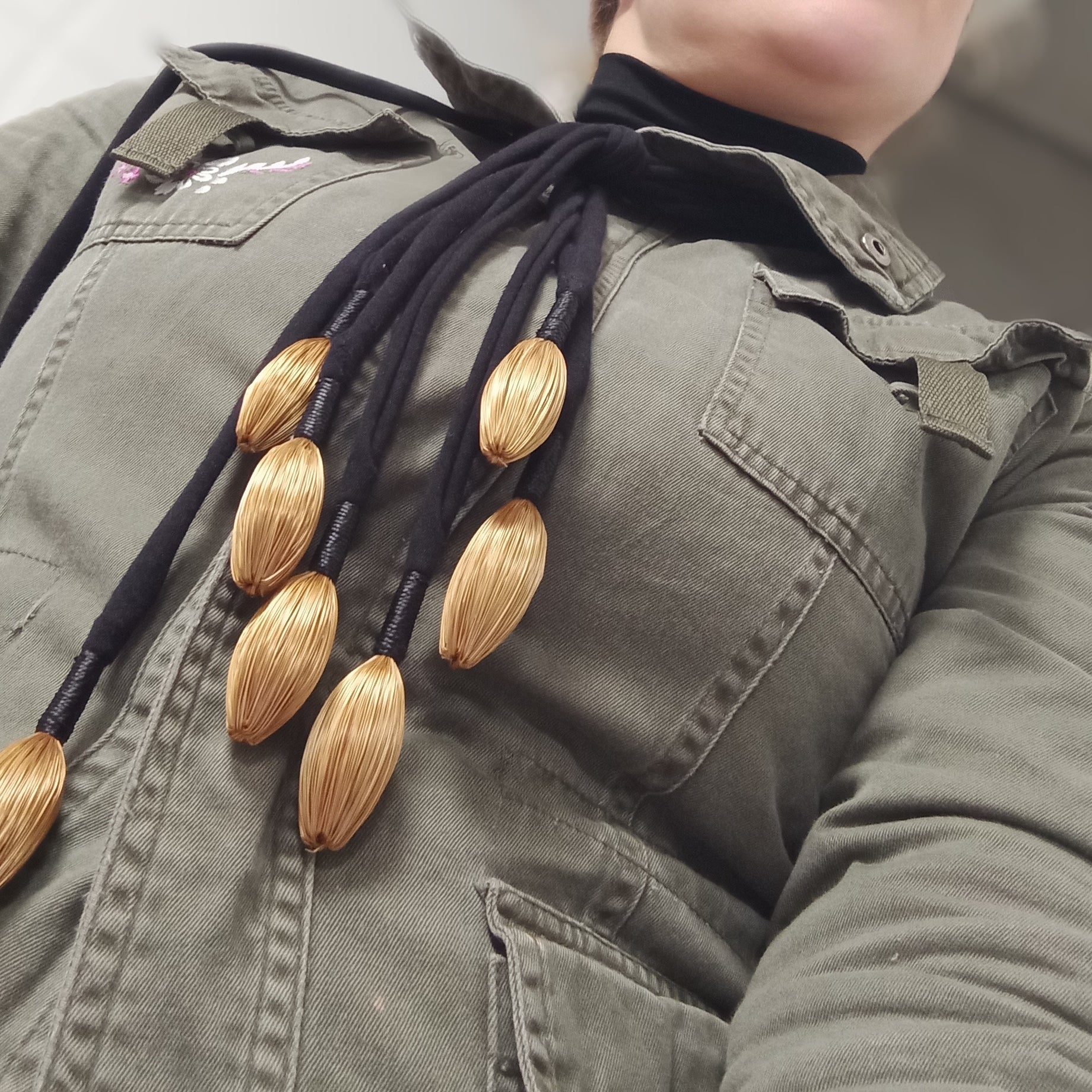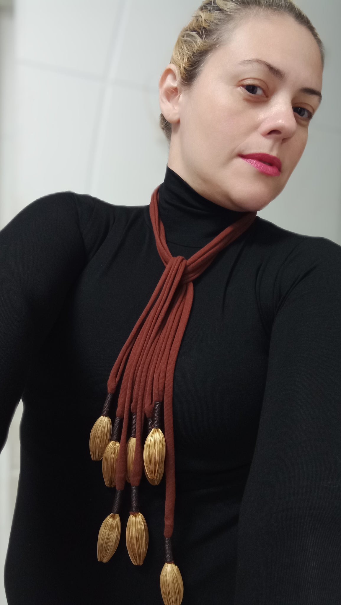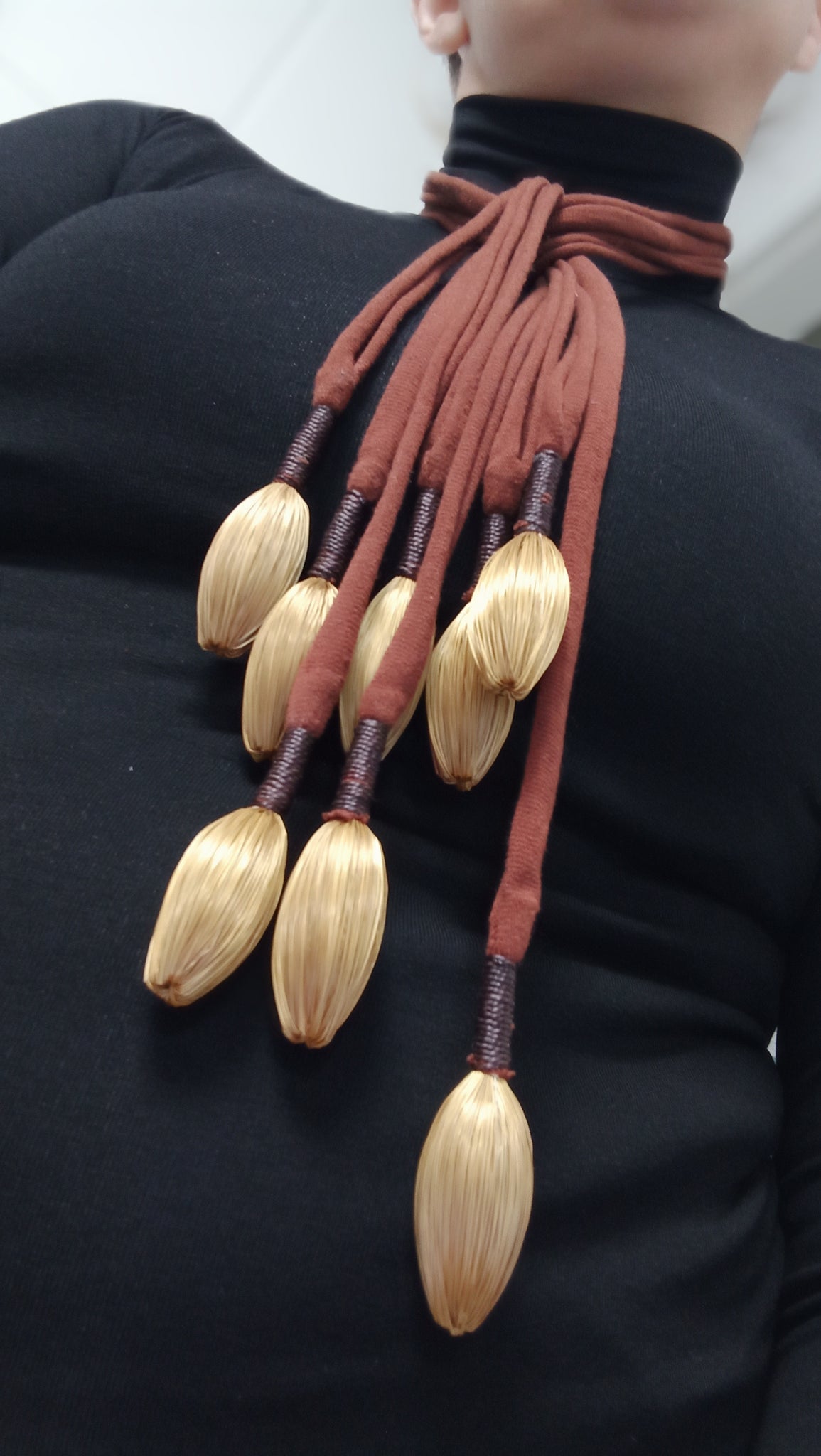 Cachecol em malha com detalhes na ponta de capim dourado , muito diferente e estiloso , combina com qualquer look e ocasião , peça feita a mão que nunca perde o brilho e não se desfaz com os anos