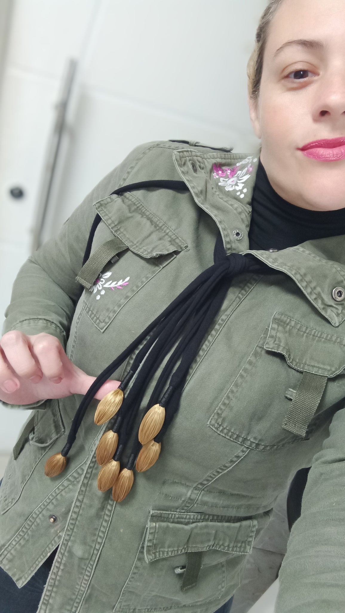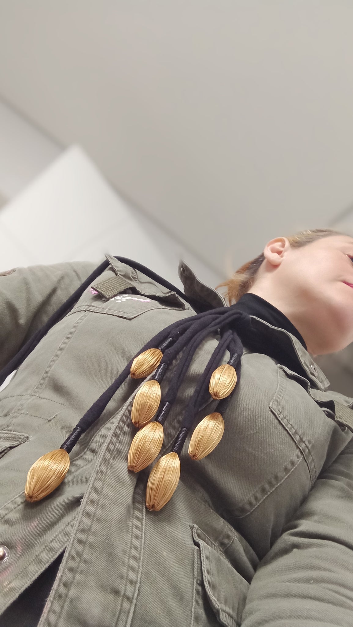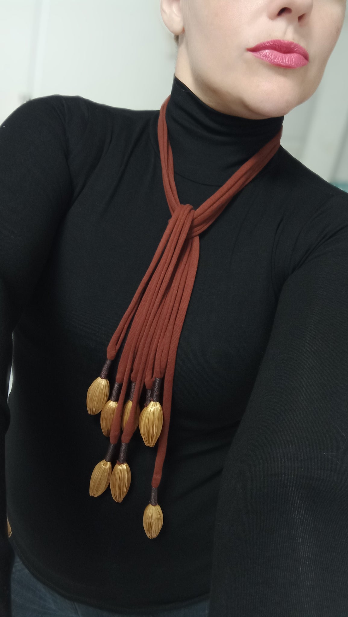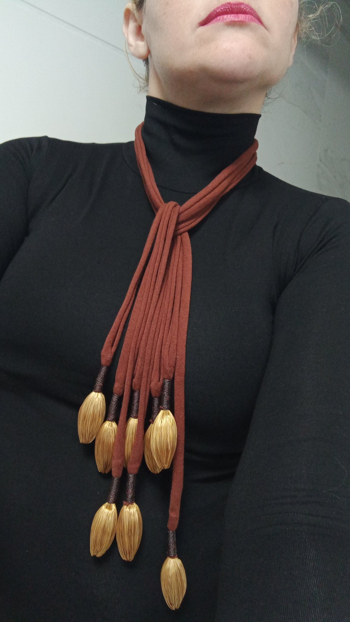 Cachecol em malha com detalhes na ponta de capim dourado , muito diferente e estiloso , combina com qualquer look e ocasião , peça feita a mão que nunca perde o brilho e não se desfaz com os anos