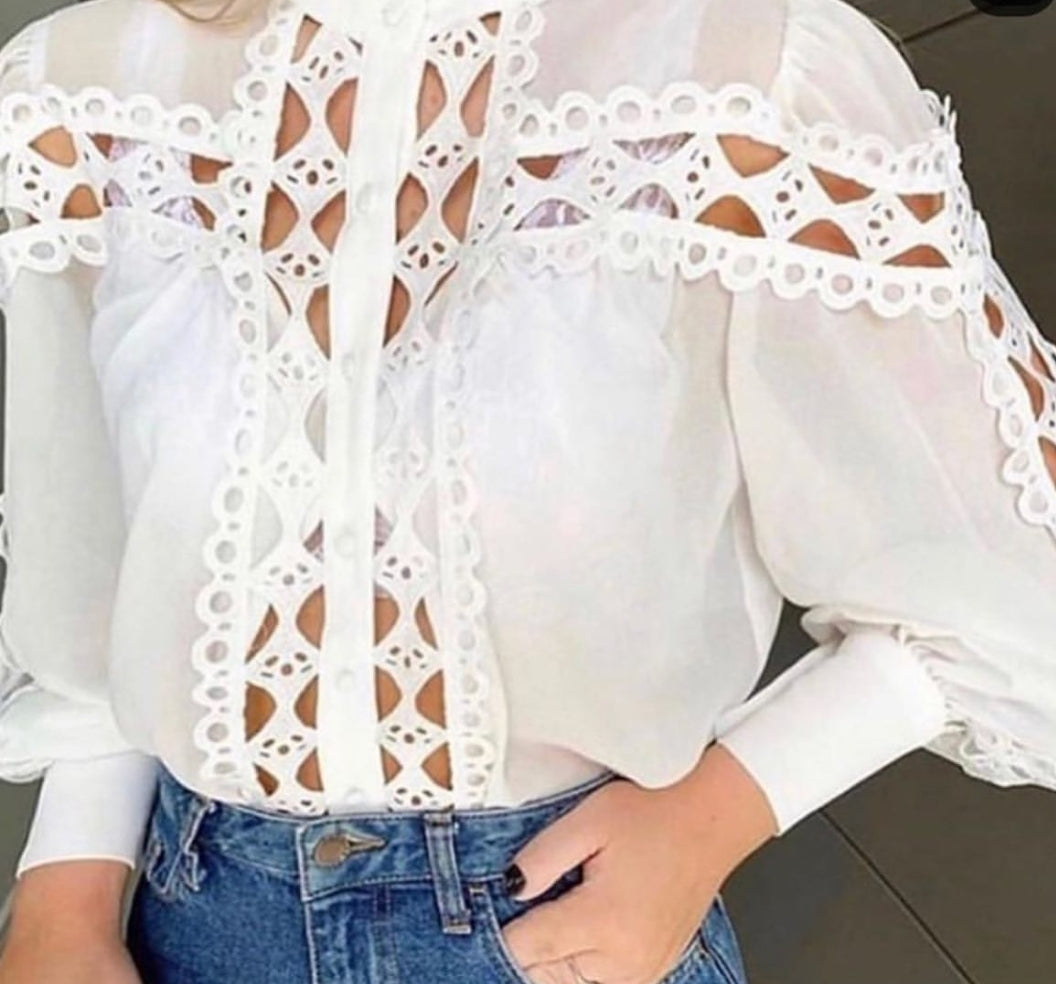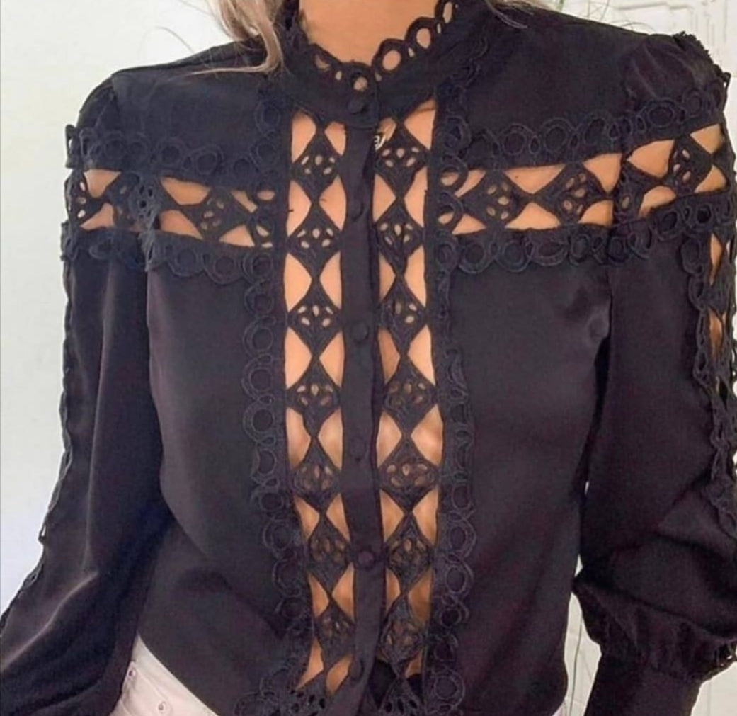 Camisa de gola vazada a detalhes frontais e nas mangas. Blusa super estilosa.