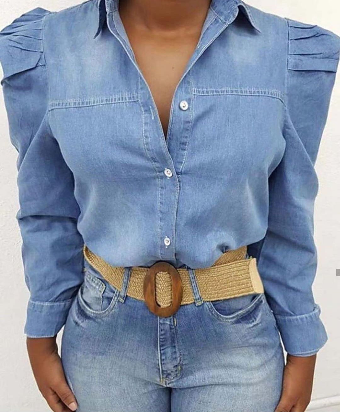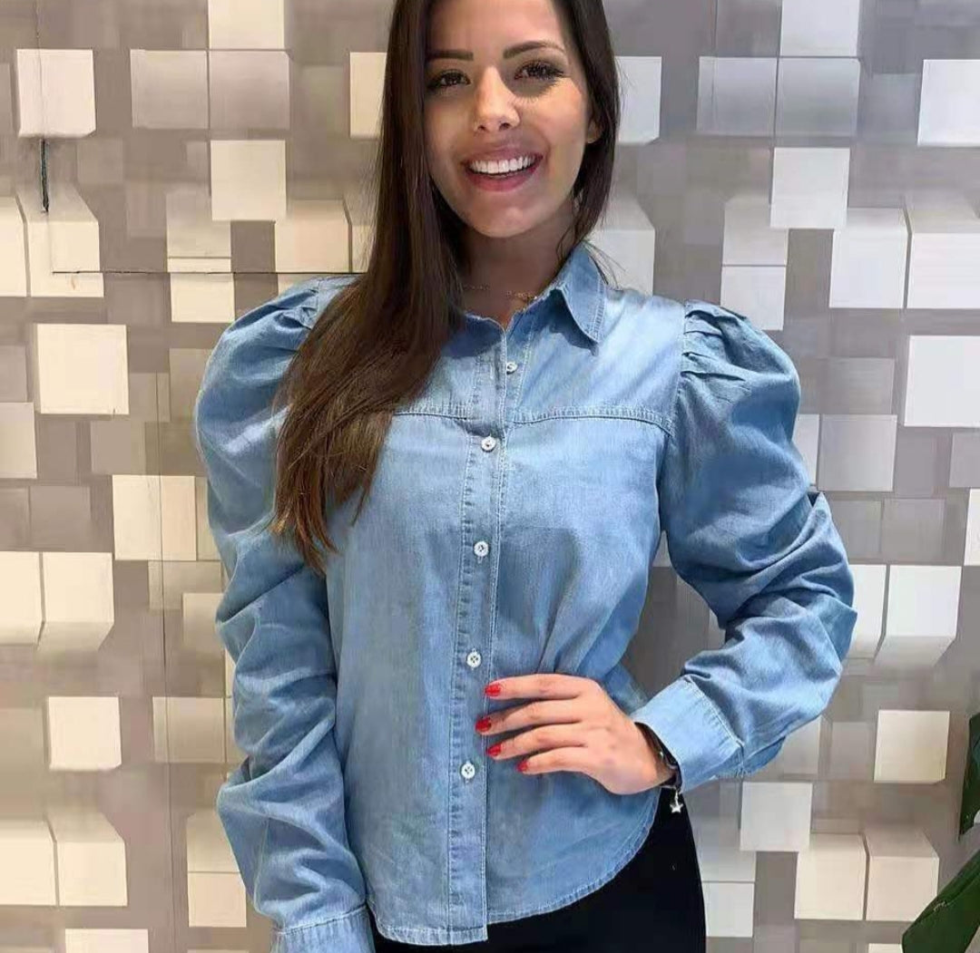 Camisa com botões frontais e manga bufante super charmosa e atual em um estilo clássico e moderno a sua proposta segue do verão ao inverno. Tecido jeans leve e lavado.
