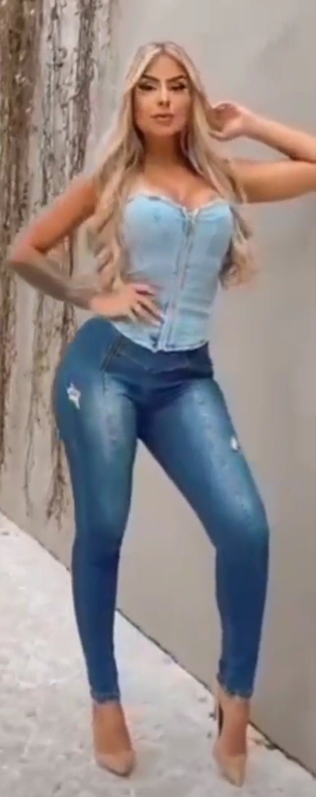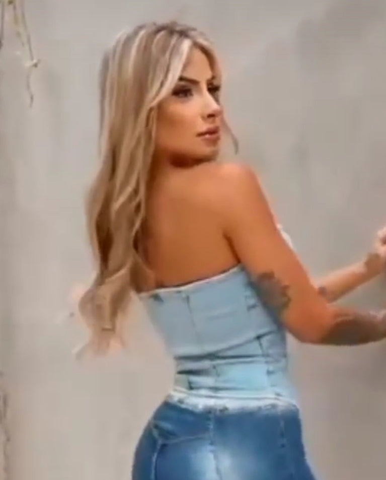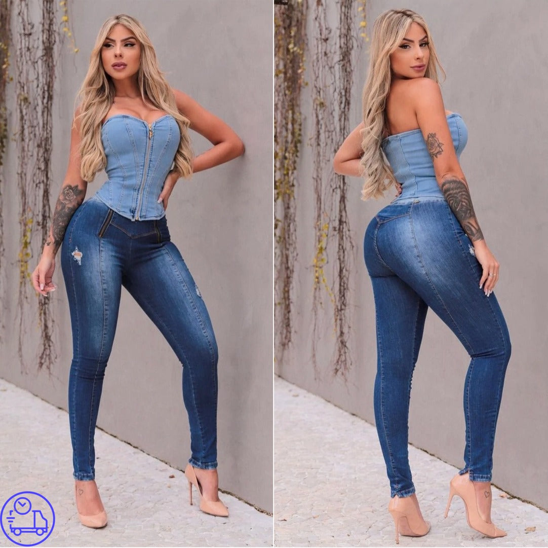 Cropped em jeans com elastano tomara que caia com zíper frontal na lavagem clara, detalhe frontal em Pontal.
