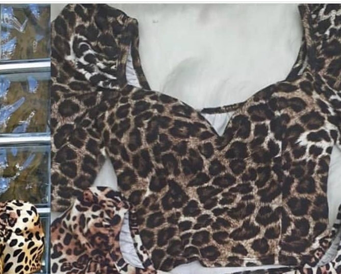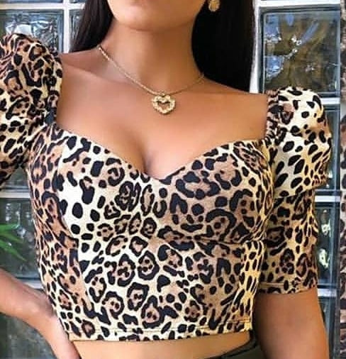 Cropped animal print decote princesa e manga bufante com bojo para garantir maior sustentação tecido em crepe.