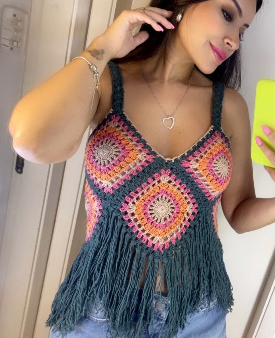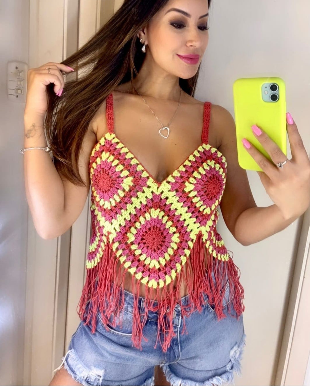 Cropped em trama de crochê com tiras na parte baixa , resistente , soltinho e bem colorido, look moderno e autêntico