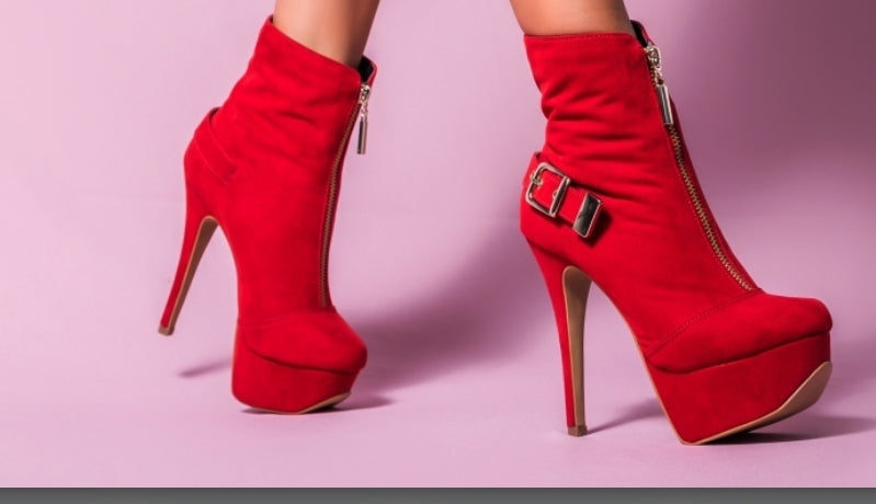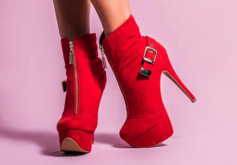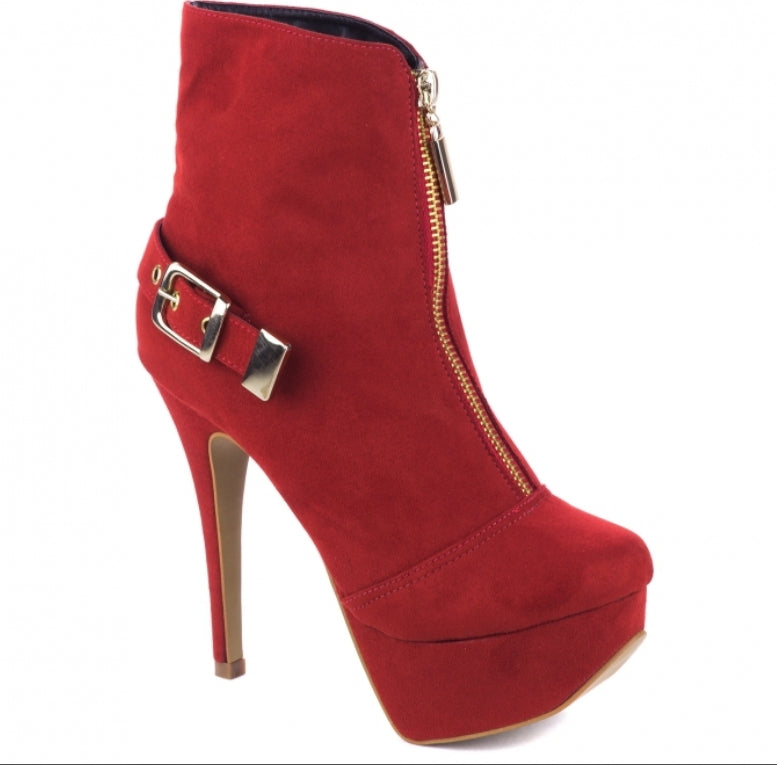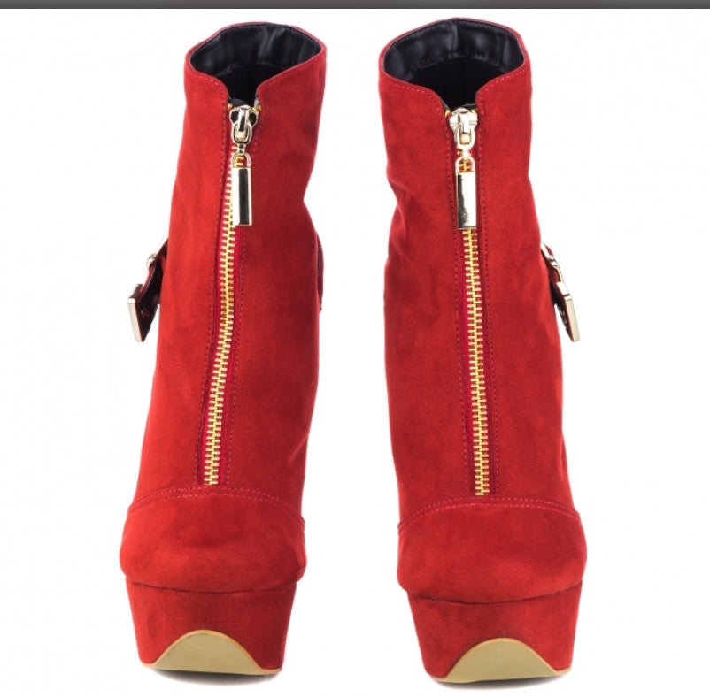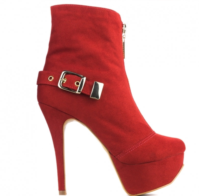Bota cano curto com meia pata feminina, material sintético na cor vermelho, enfeite com fivela na cor dourado, fechamento de zíper na parte frontal na cor dourado, meia pata externa encapada na cor vermelho, salto encapado em material sintético na cor vermelho e com 13 cm de altura, sola emborrachada na cor bege.