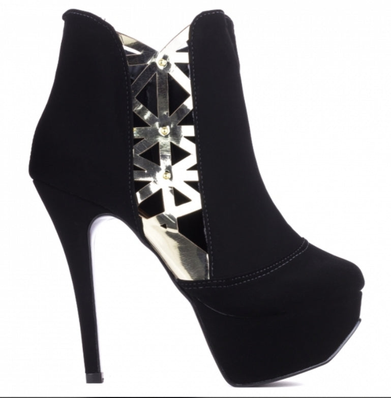 Bota cano curto com meia pata feminina, material sintético nas cores preto e ouro light, enfeite na lateral com cortes a laser na cor ouro light, fechamento de zíper na parte interna na cor dourado, meia pata externa encapada na cor preto, salto encapado em material sintético na cor preto e com 13 cm de altura, sola emborrachada na cor preto