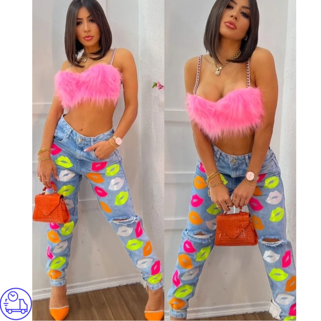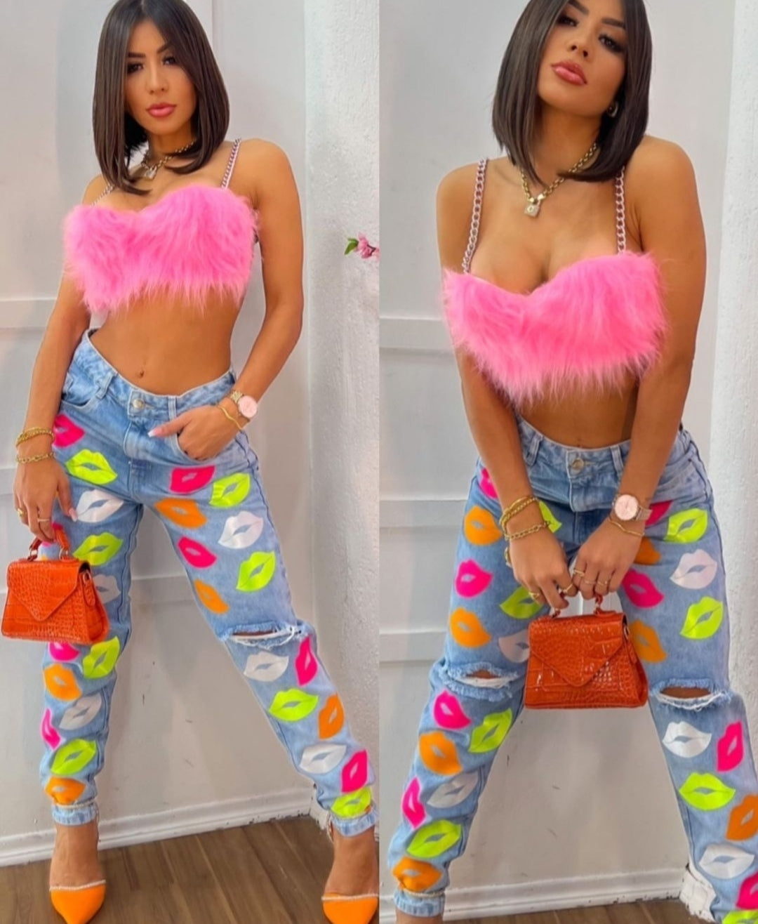 Calça jeans sem lycra customizada em várias tonalidades, produto exclusivo de muito estilo. Fôrma tamanho normal. Pode haver variações na lavagem e modelo do jeans, dependendo da disponibilidade no ato da customizaçao. Disponível do 36 ao 44