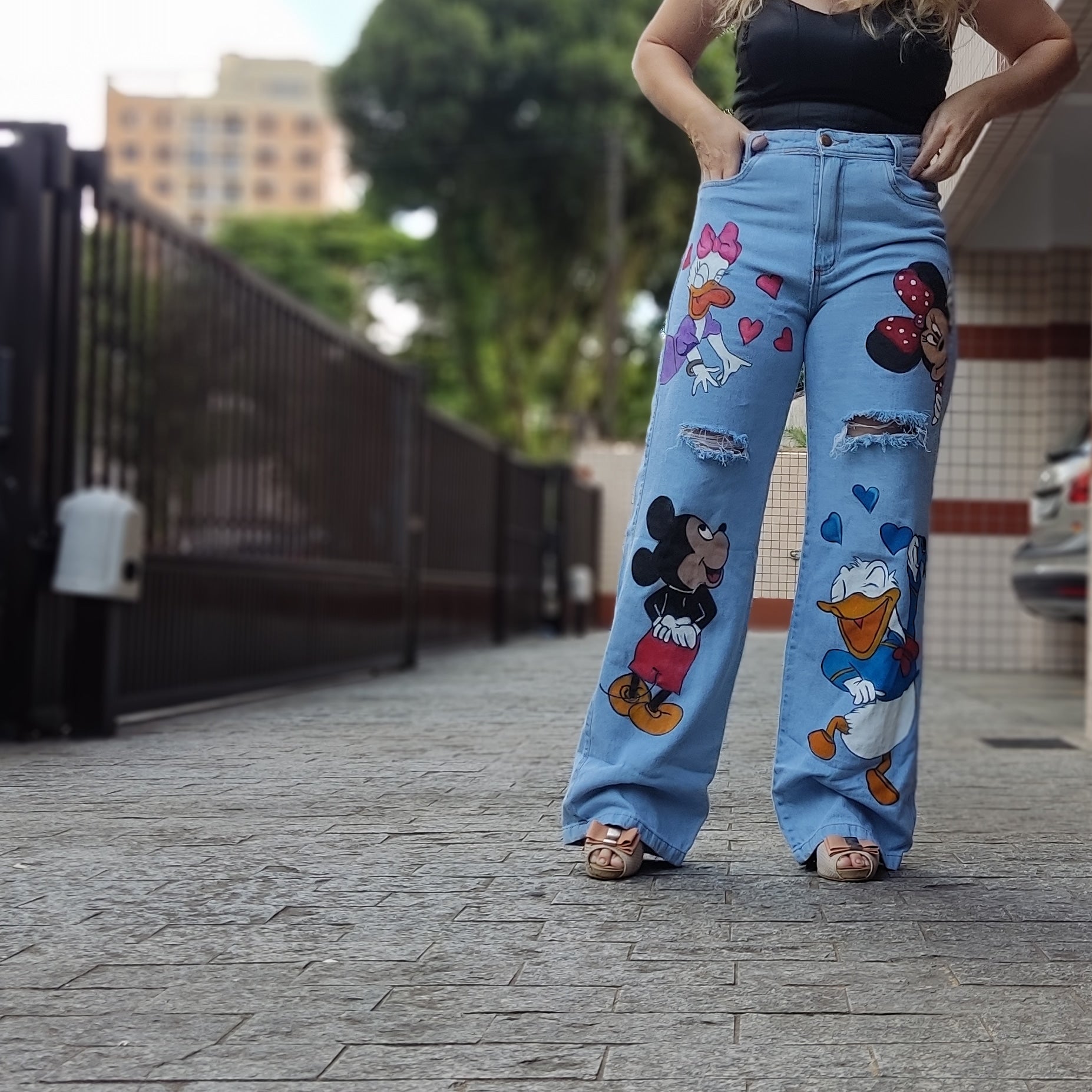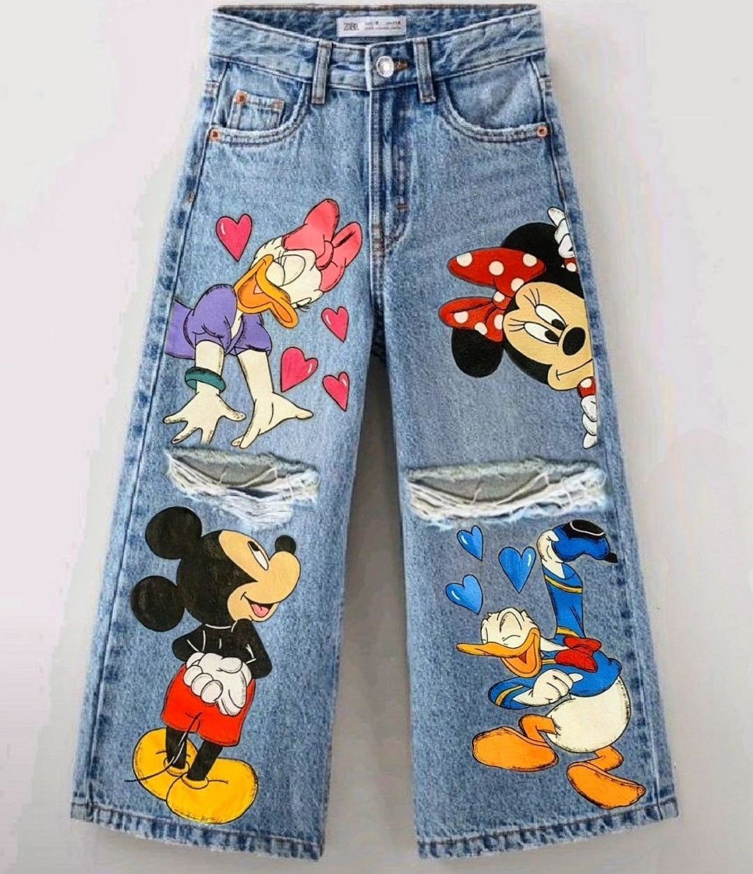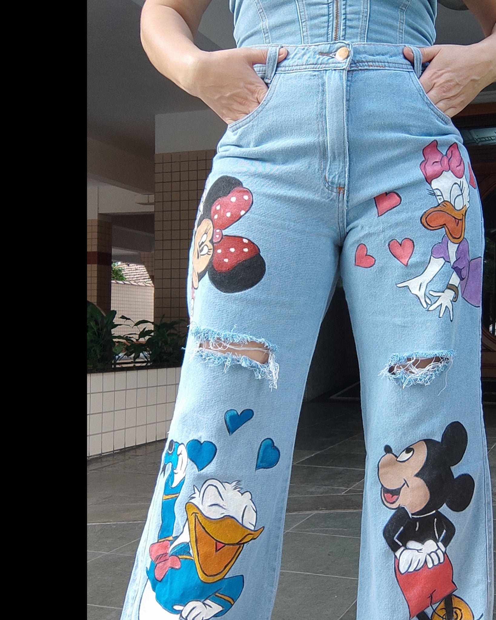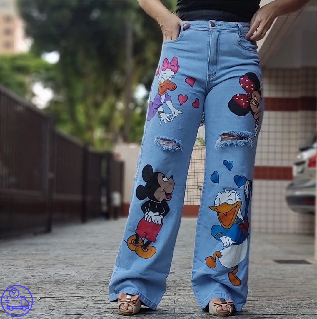 Calça em Jeans modelos wide leg sem elastano com pintura a mão , lavada. Produto produzido por pedido com tempo para envio de 5 dias uteis após a compra. Pode haver variações na tonalidade do jeans.