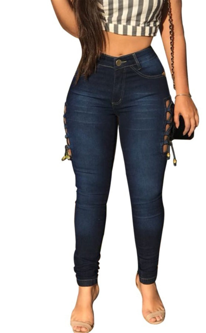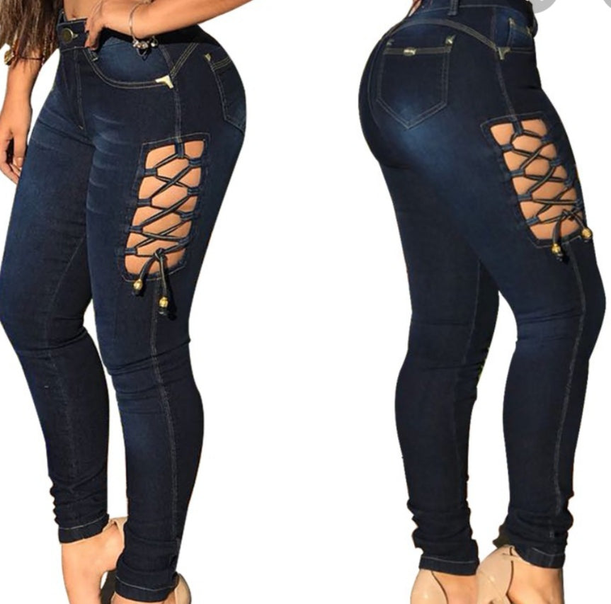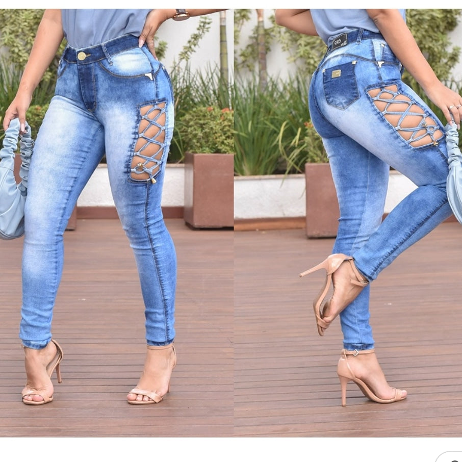 Calça jeans com elastano estica bem, detalhe com abertura trancada lateral na parte da cocha,. Modela o corpo. . Disponível nas lavagens clara e escura