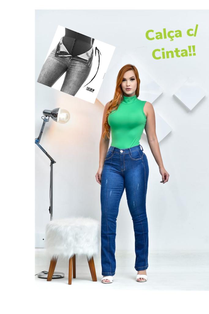 Calça jeans com lycra customizada super diferente e modeladora veste muito bem com essa cinta que segura bem a barrinha. Confortavel e moderna essa calça é um verdadeiro show. Disponível do tamanho 36 ao 54.