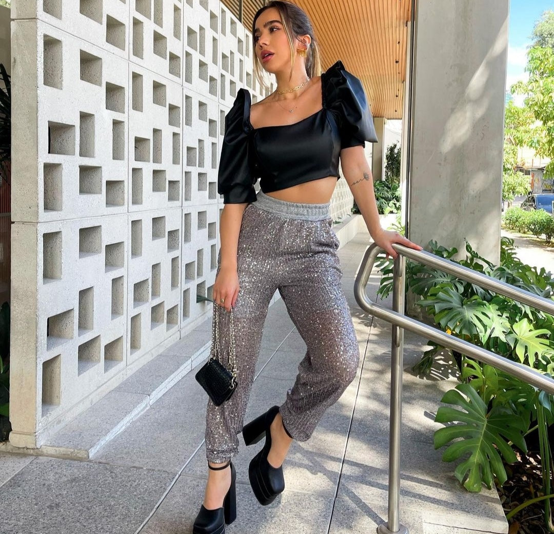 Calça toda em paetê modelo com elástico na cintura e na barra , tecido com elastano veste do 36 ao 44