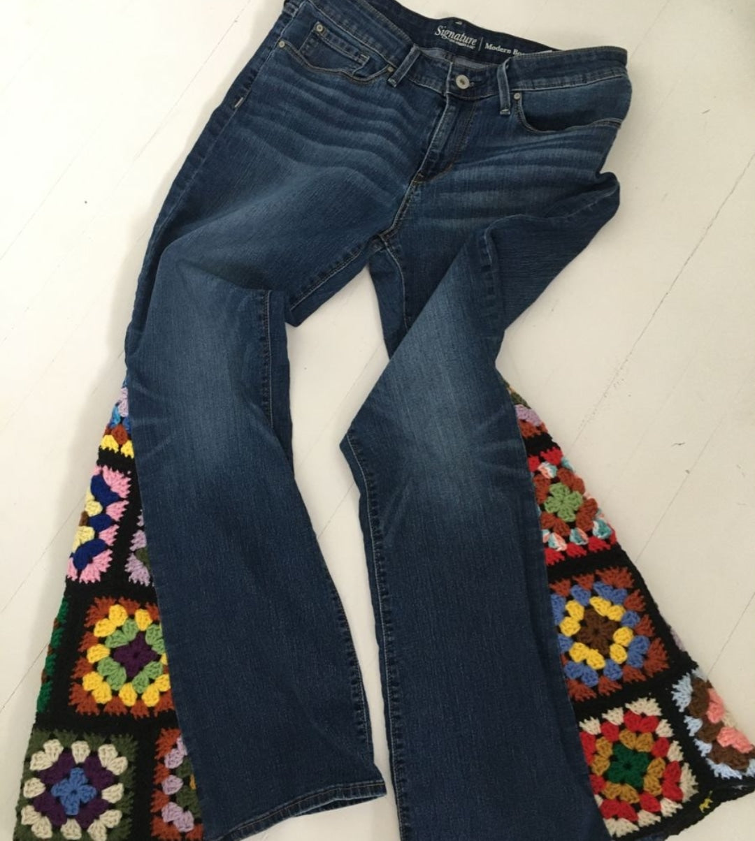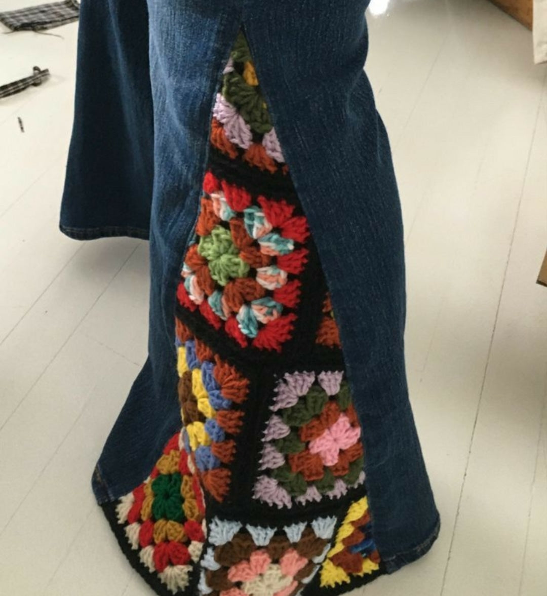 Calça em jeans com elastano cintura normal( na altura do umbigo)com customização na barra em crochê designe flair , bolsos traseiro . disponível do 34 ao 54 . Nas lavagens clara ou escura