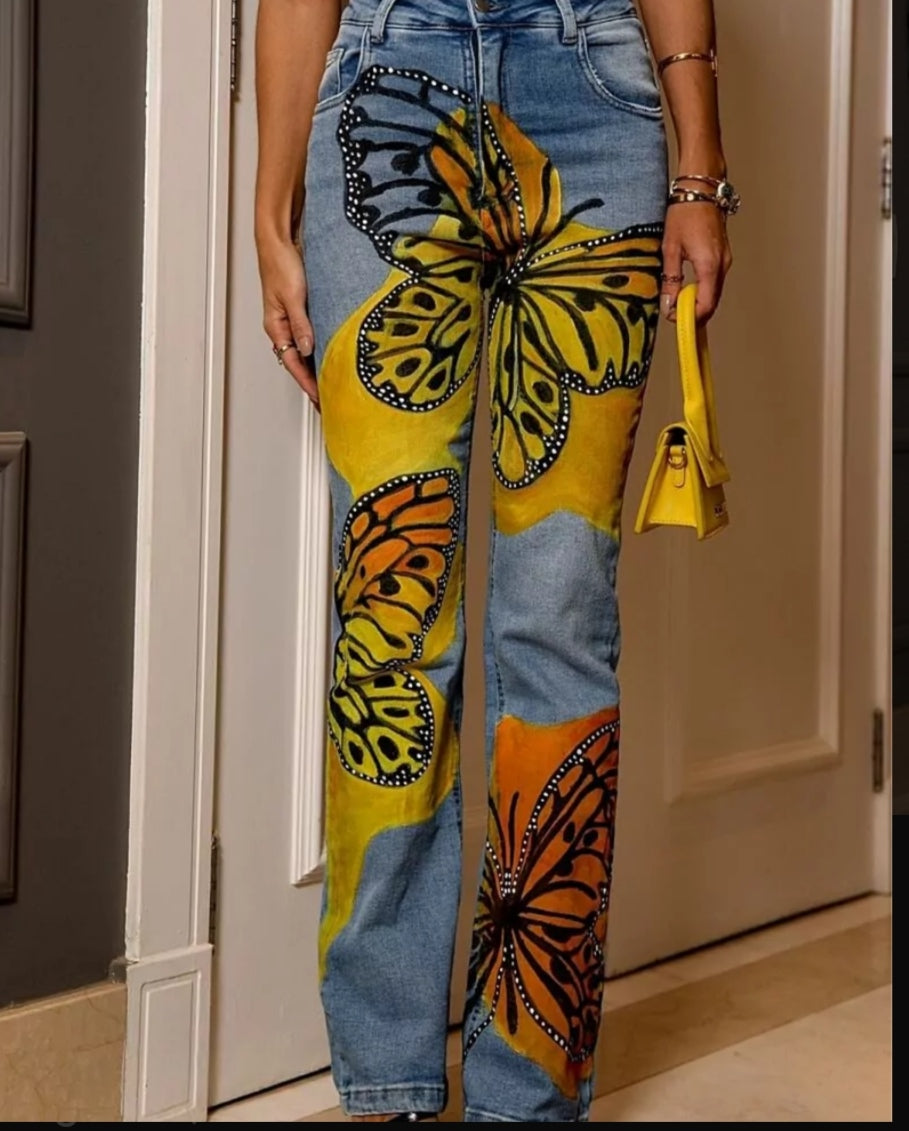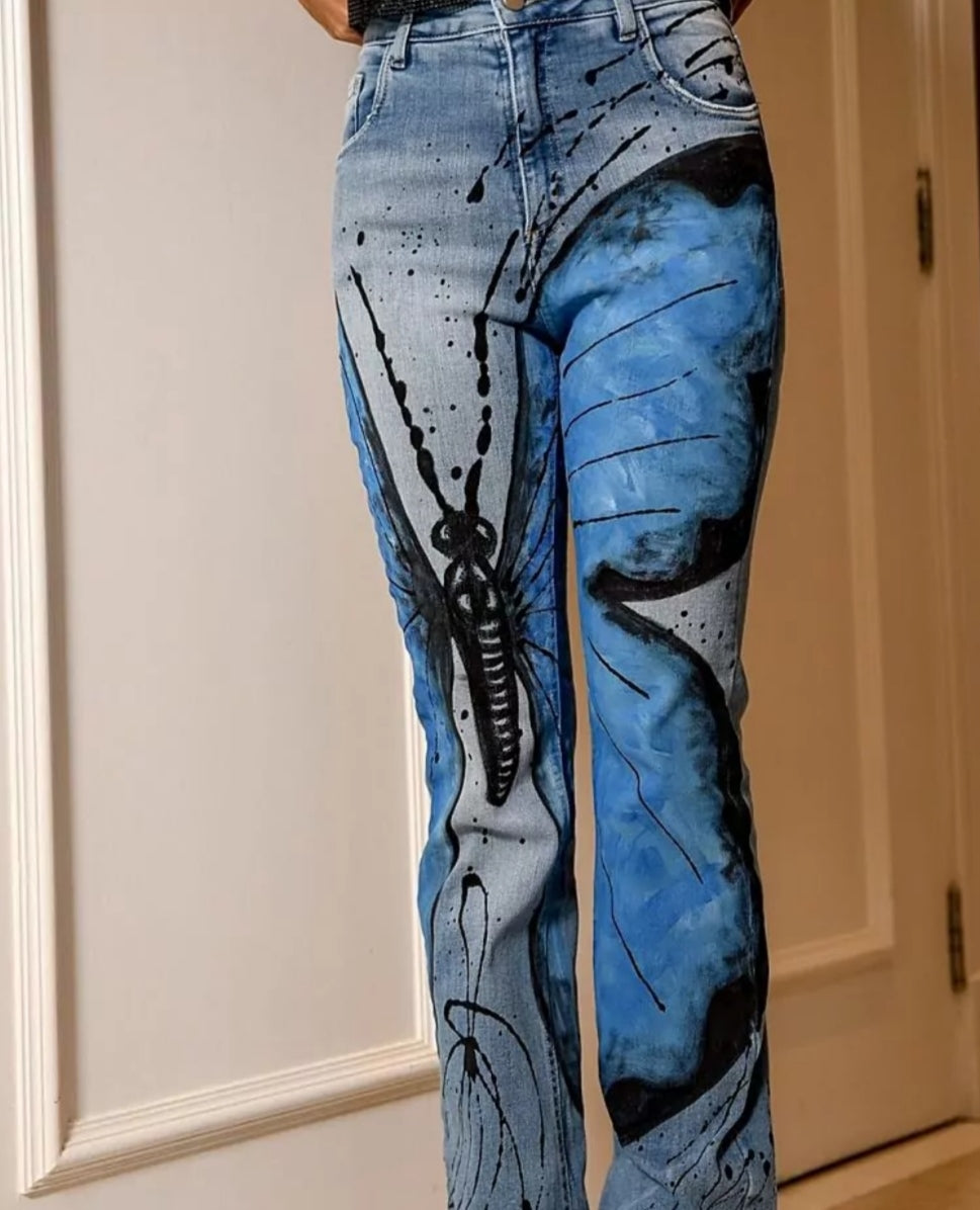 Calça em jeans sem lycra, modelo levemente flair pintado a mão na parte frontal . Peças diferenciada . Disponível do 34 ao 44