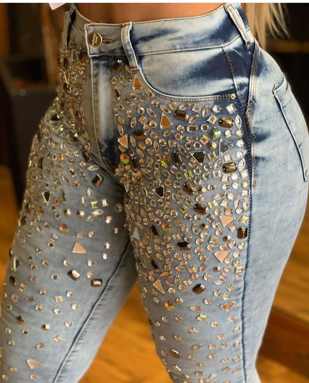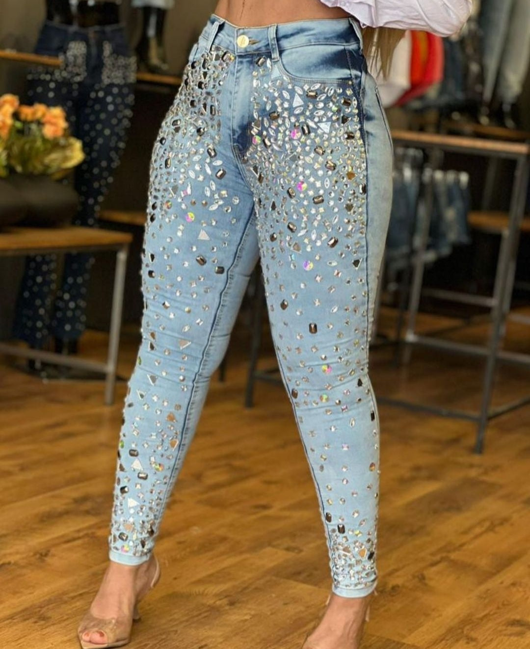 Calça em jeans com Lycra toda bordada costurada em pedraria espelhada na parte frontal , tecido com bastante elastano estica bem , conforto e estilo . Disponível do 34 ao 46, nas lavagens clara e escura