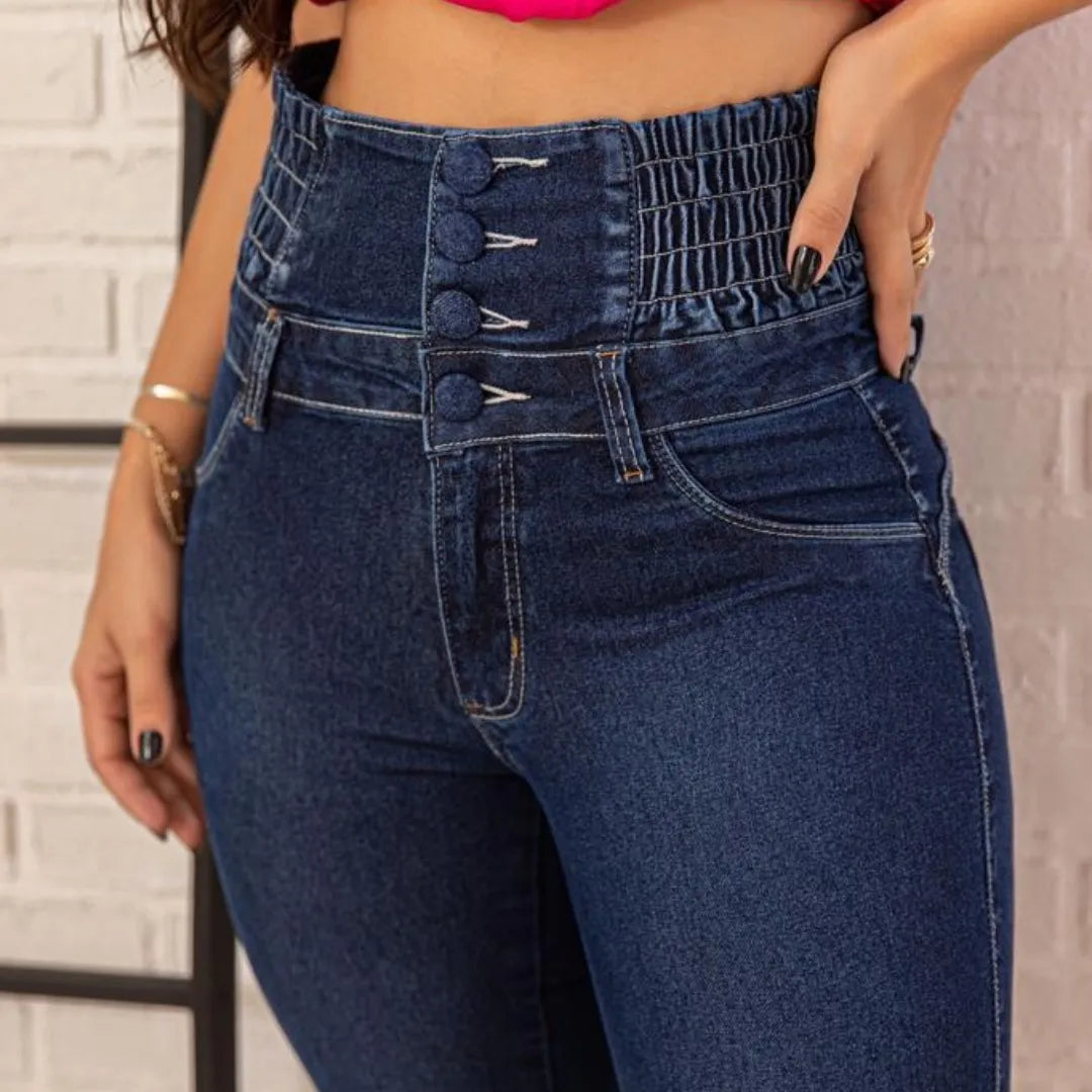 Calça jeans com Lycra estica bem , cintura alta com elástico modeladora segura a barriga, confortável de alta qualidade com botões de feixo frontal e bolsos laterais e traseiros