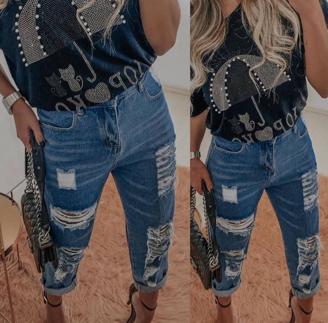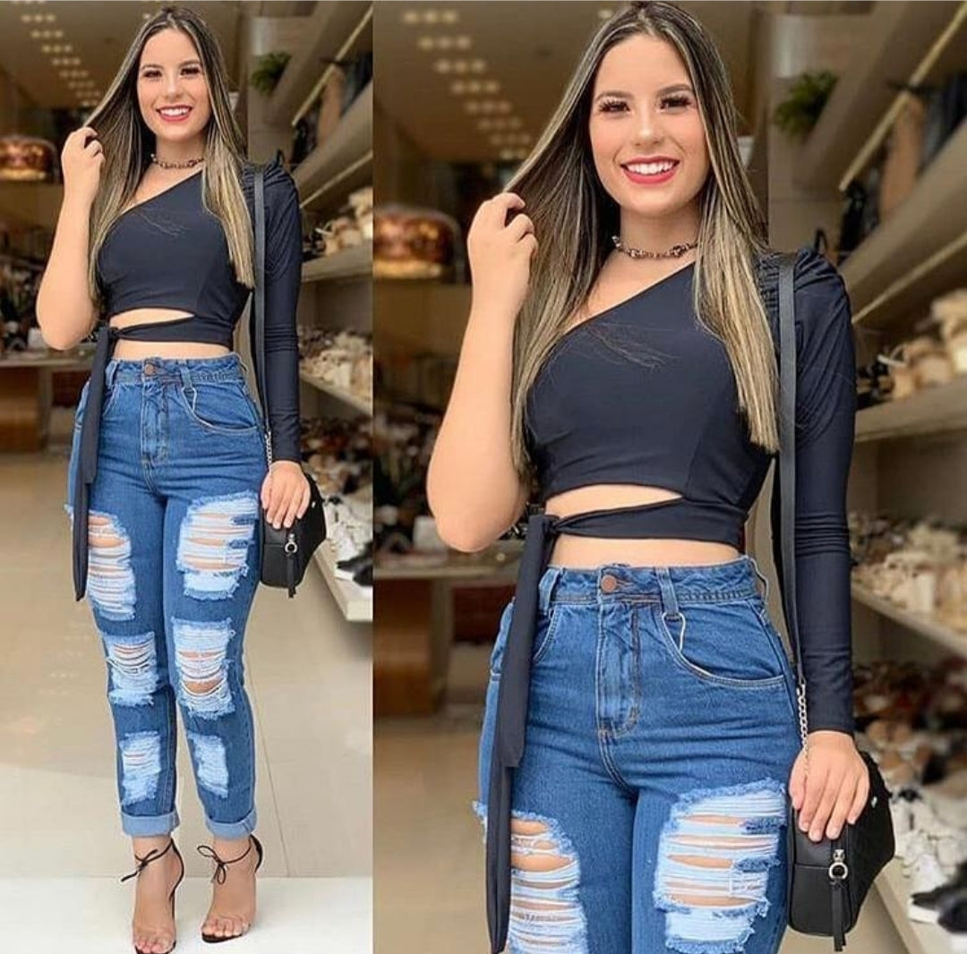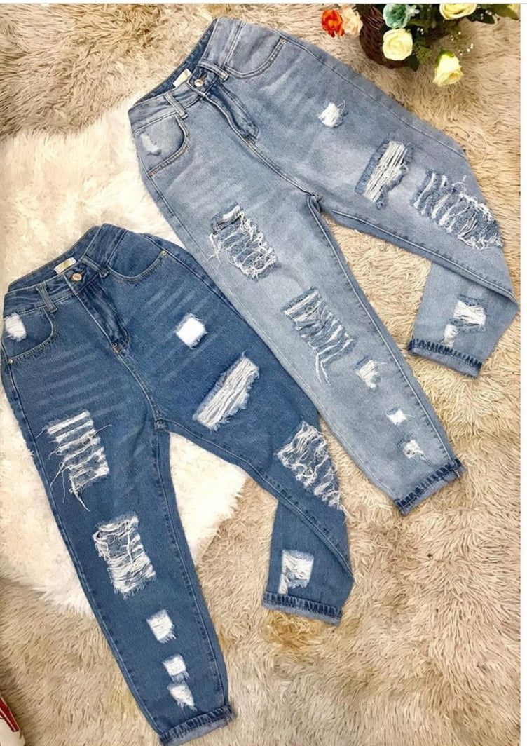 Calça jeans Customizada sem lycra, cintura alta modelo slim nos tons claro e escuro.