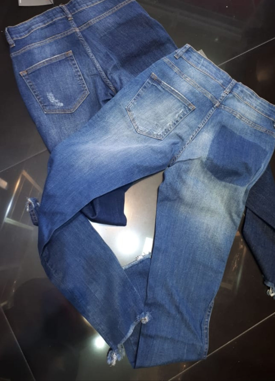 Calça jeans modelagem jeans com lycra veste muitissimo bem dois bolsos frontais e um traseira desfiado na barra e rasgado na altura do joelho direito conforto e sofisticação nessa peça street