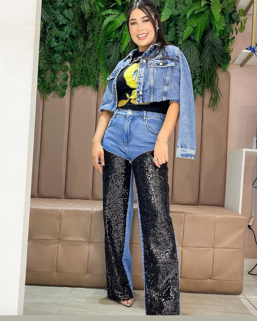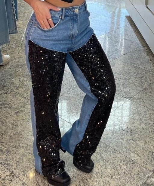 Calça em jeans sem lycra modelo "wide leg" , coz altura do umbigo customização frontal em paetê, produto produzido por pedido. Tempo de envio 5 dias úteis após a compra.