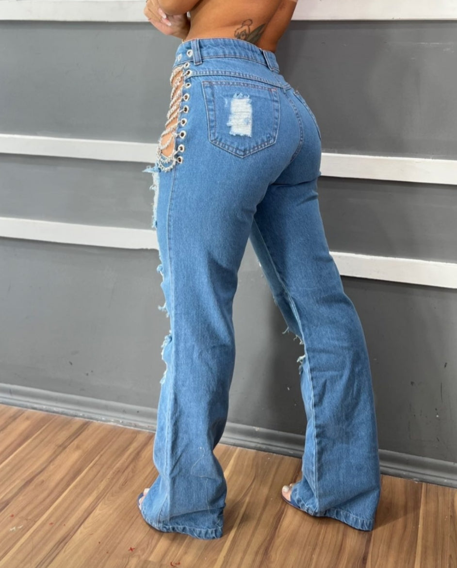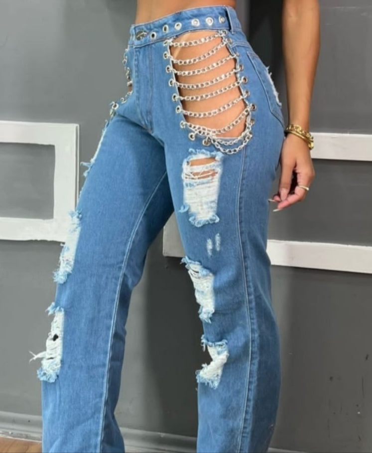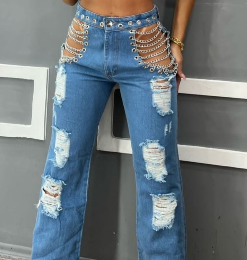 Calça em jeans modelo moon 100%algodao com detalhes laterias em ilhós com correntes e taxas disponível do 36 ao 54