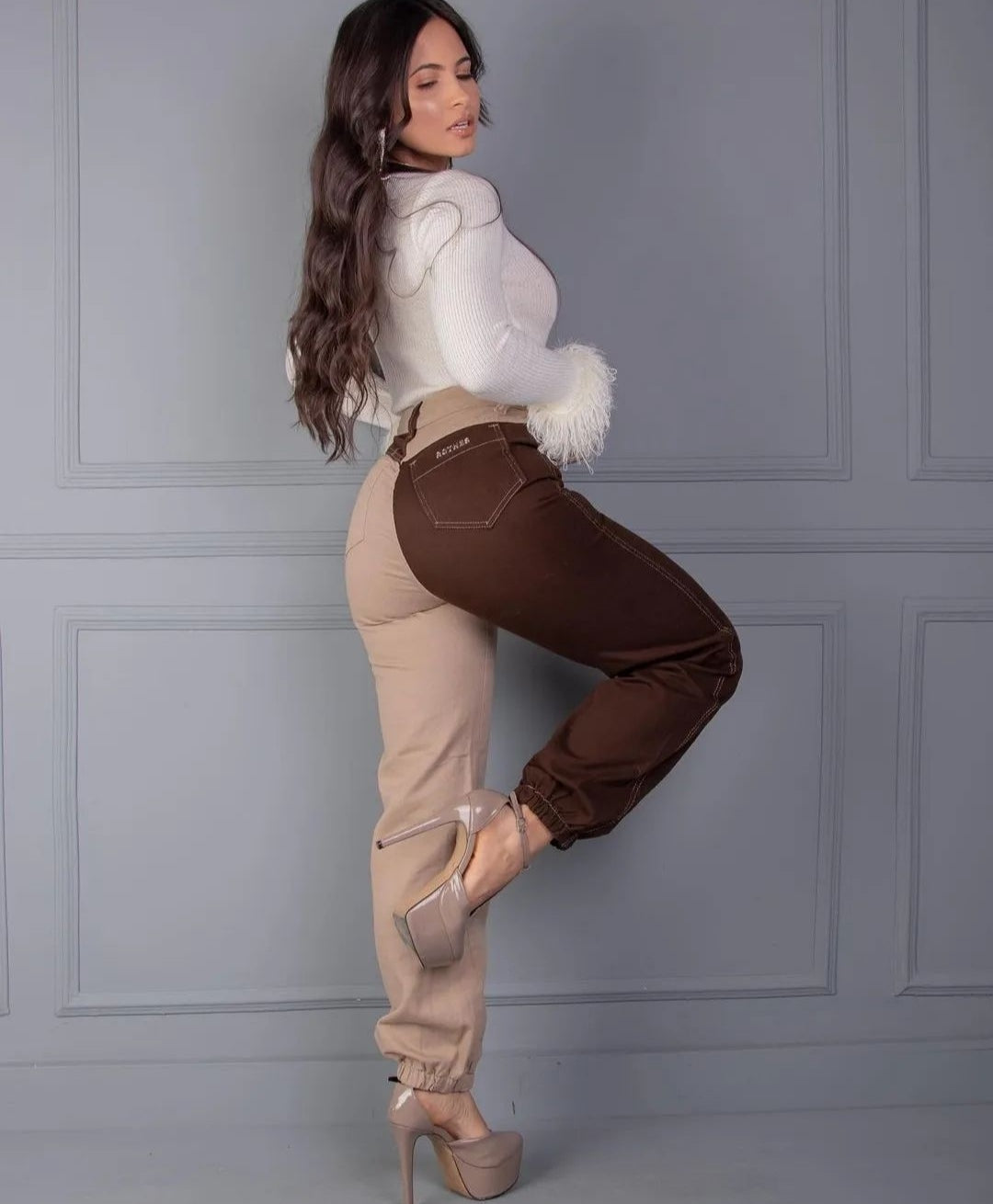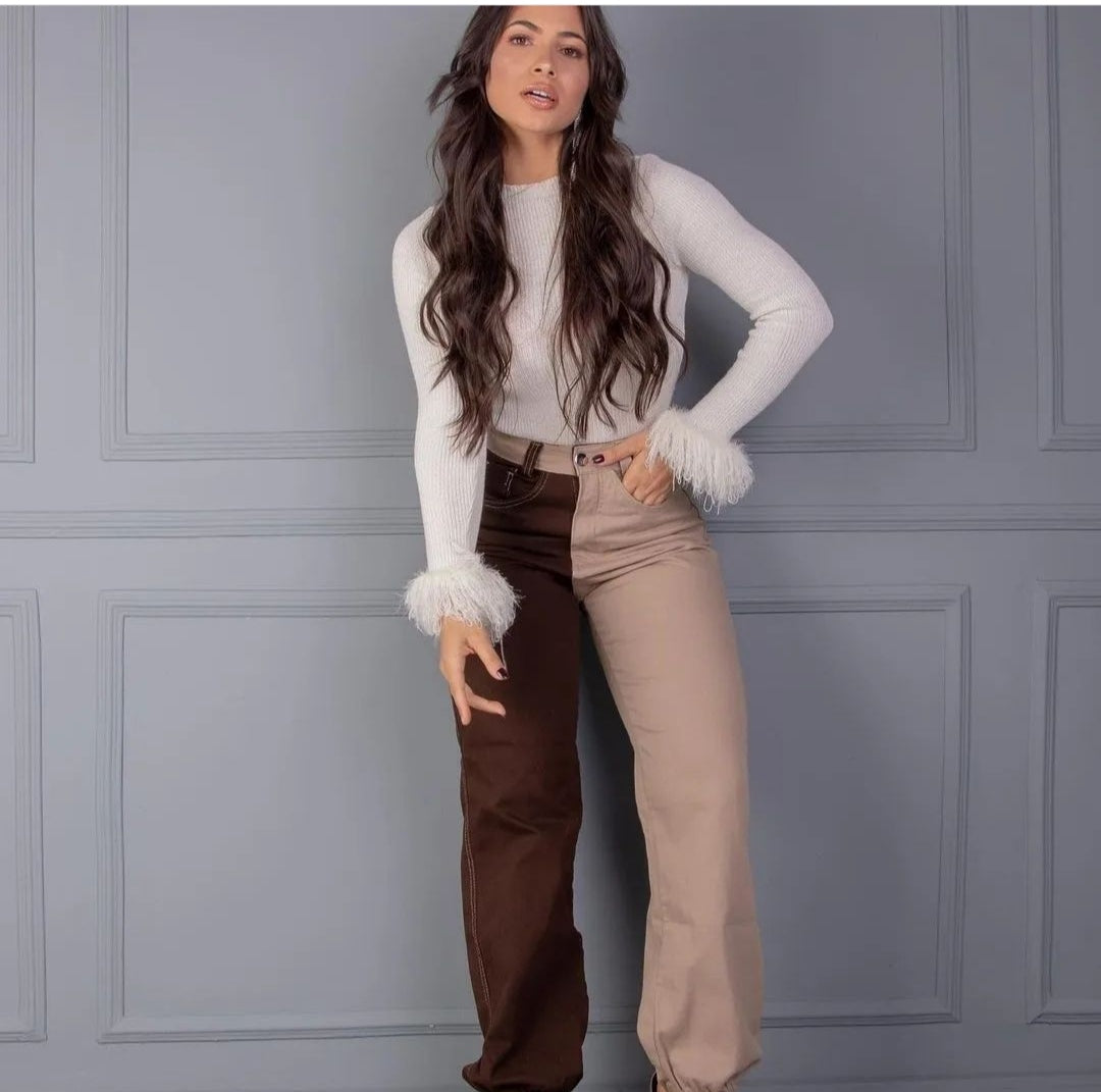 Calça em brim sem lycra modelo customizada com duas tonalidades marrom e bege , modelo diferenciado bem estiloso tecido que não estica ,estilo moon com bolsos laterias e traseiros