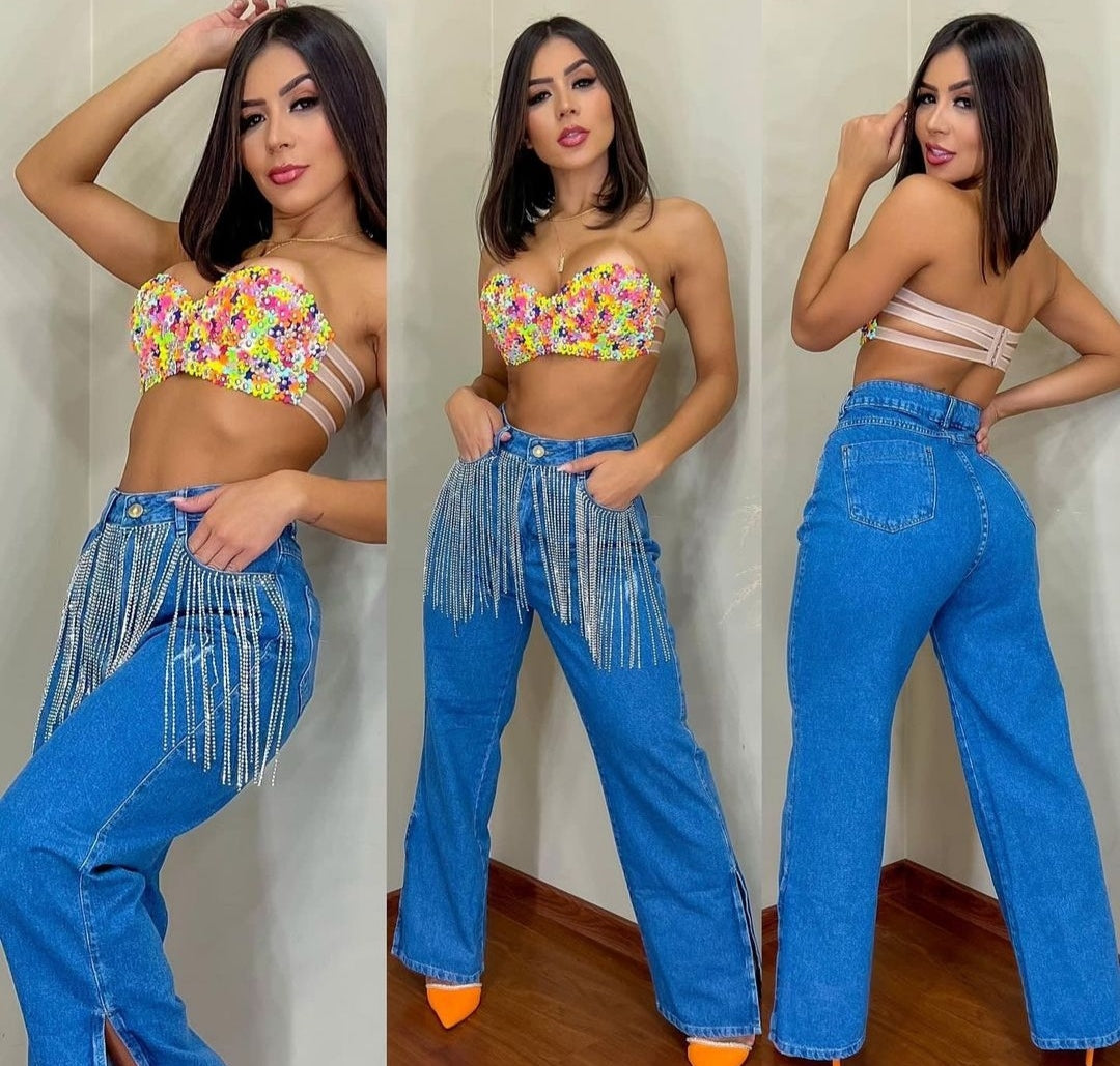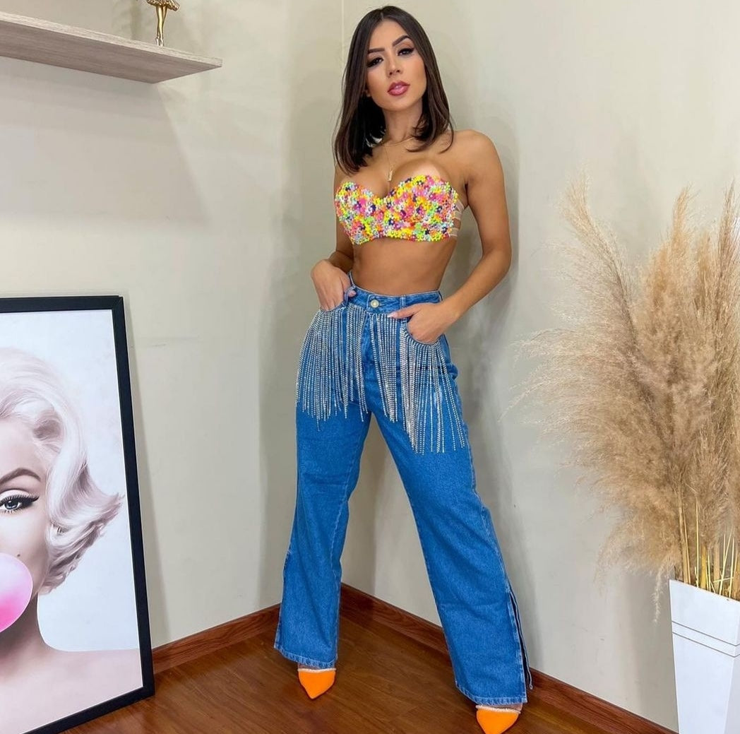 Calça em jeans com ou sem lycra customizada com strass bordado na parte frontal em franjas . Disponível do 36 ao 54 . Disponível nas lavagens clara e escura .