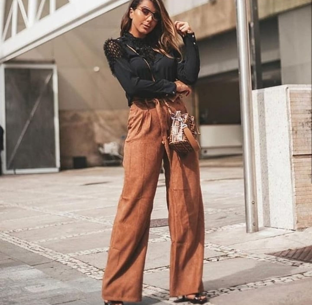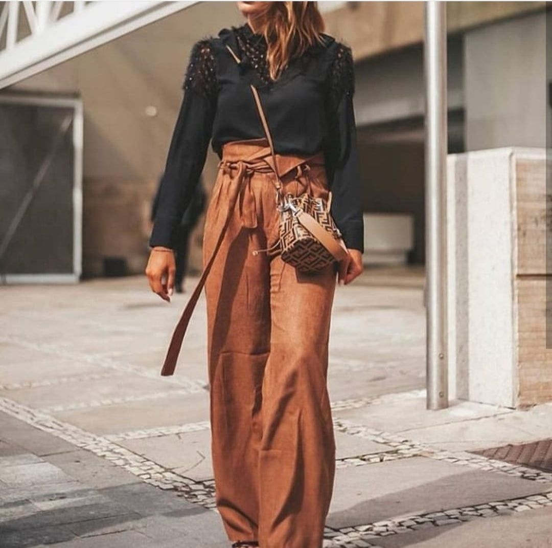 Calça pantalona em linho rustico com detalhes na cintura em courino e cinto em courino, bolsos frontal. Tecido de excente qualidade e veste muto bem. Ziper traseiro