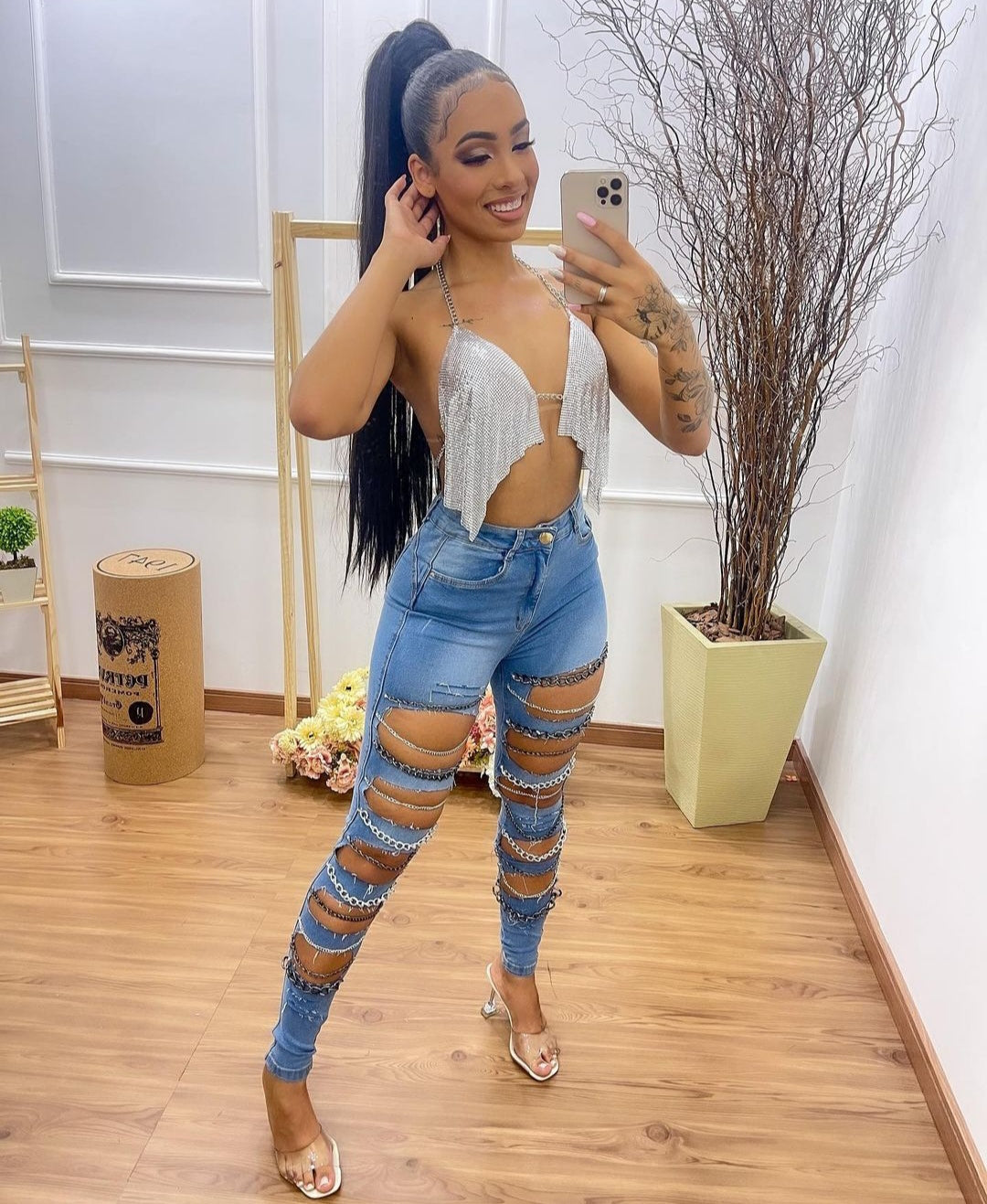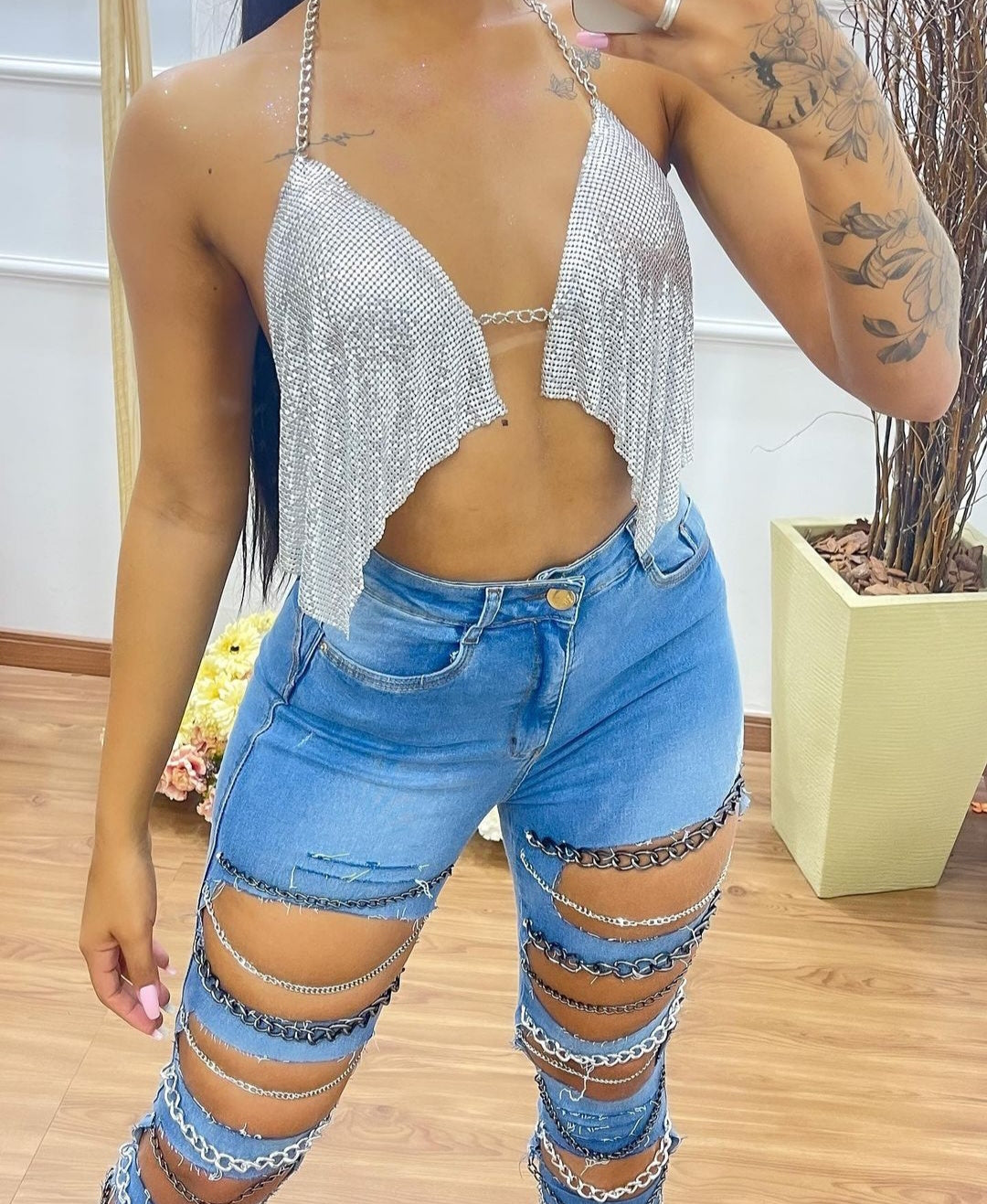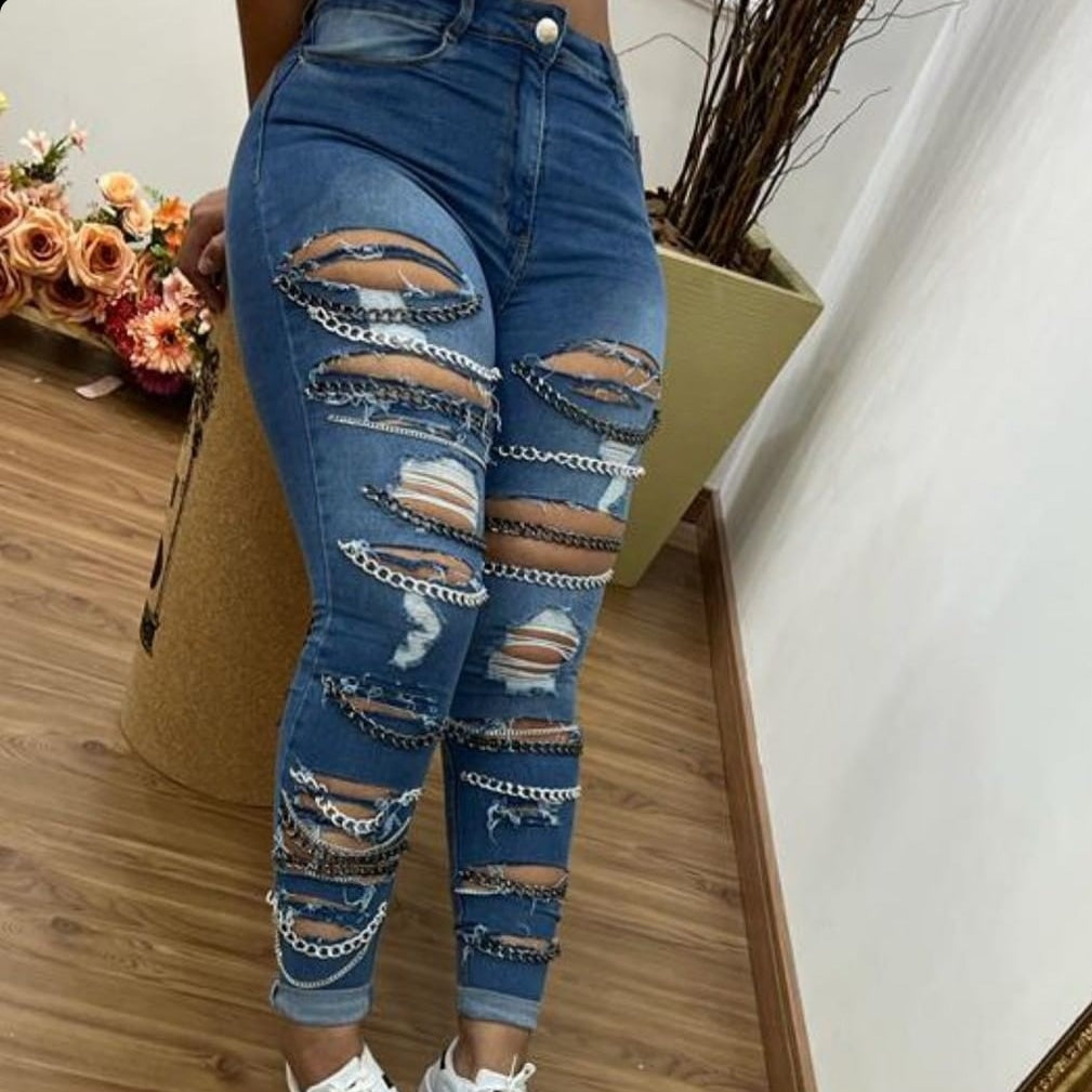 Calça jeans com elastano estica bem cós alto com rasgo e detalhes em correntes costuradas que não solta e não enferruja ao lavar.