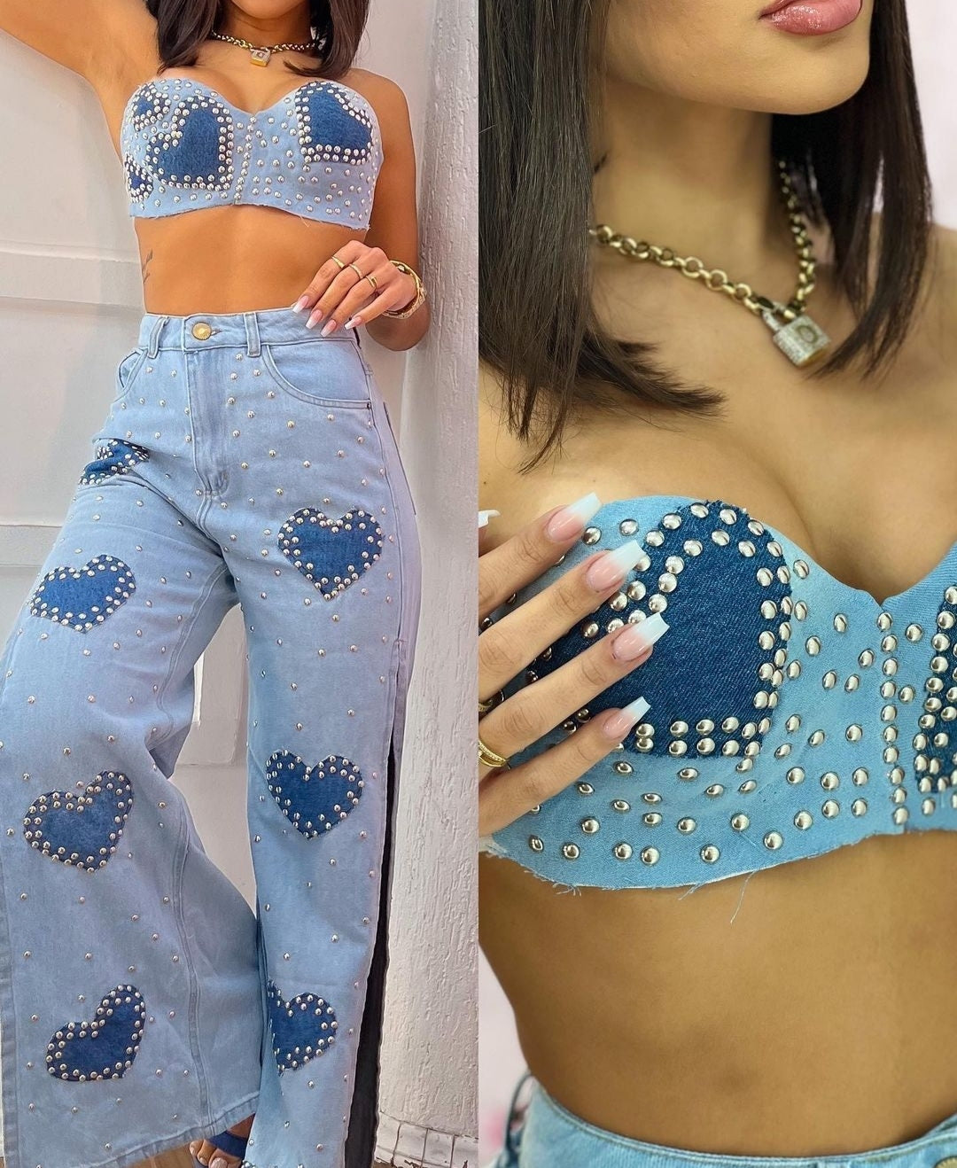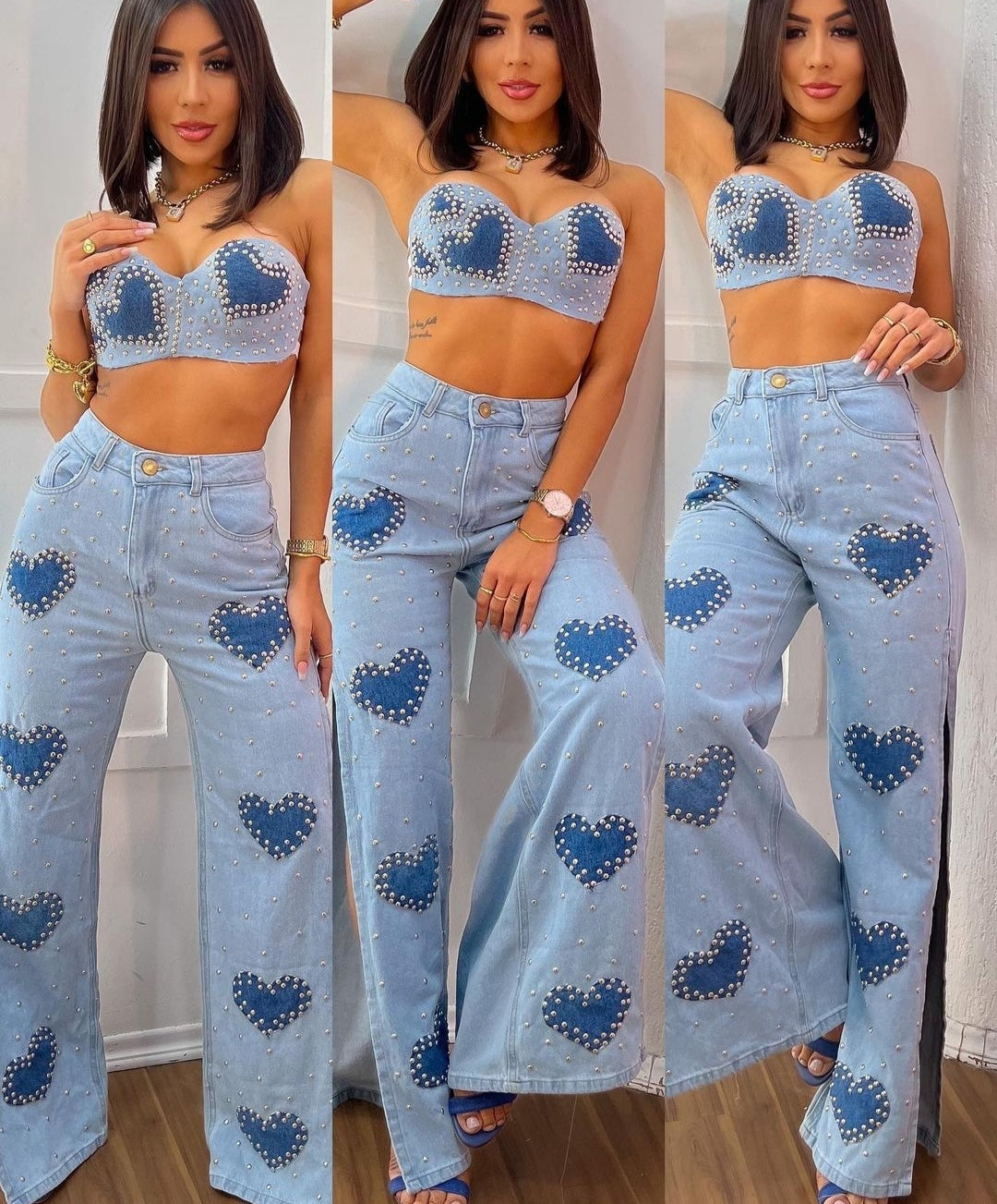 Calça em jeans sem lycra, modelo pantalona com fenda lateral . Detalhes Frontais com corações jeans na lavagem mais escura e taxinhas . Forma tamanho normal. Caimento perfeito. Disponíveis do 34 ao 44