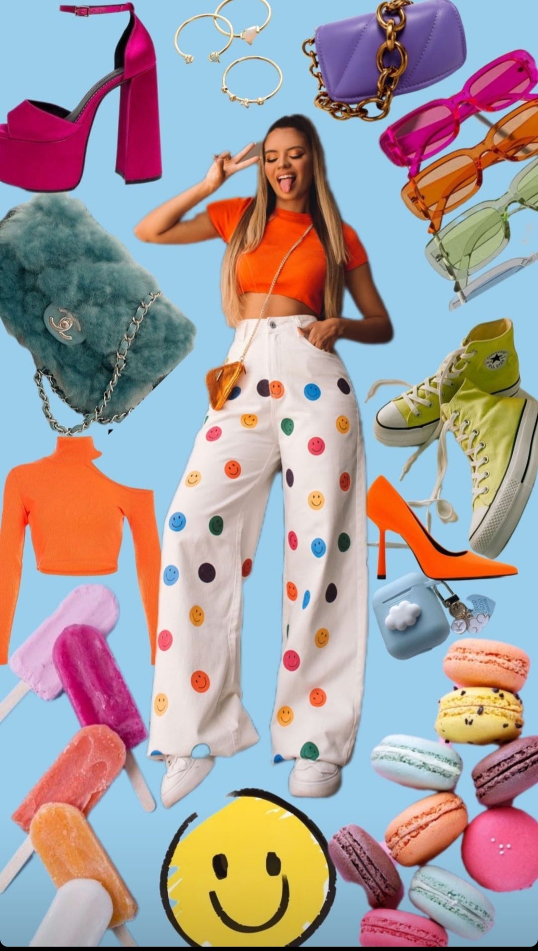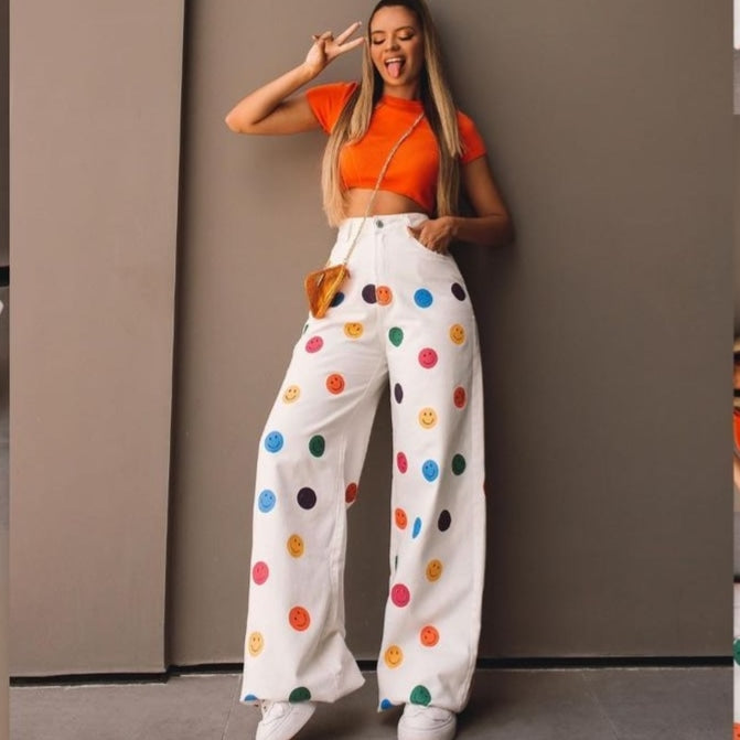 Calça em jeans modelo pantalona sem lycra pintada com smile na parte frontal e traseira cintura alta , forma tamanho normal. (Porduto pintada a mão produzido por pedido , não realizamos troca e devoluçao) disponível do 36 ao 44