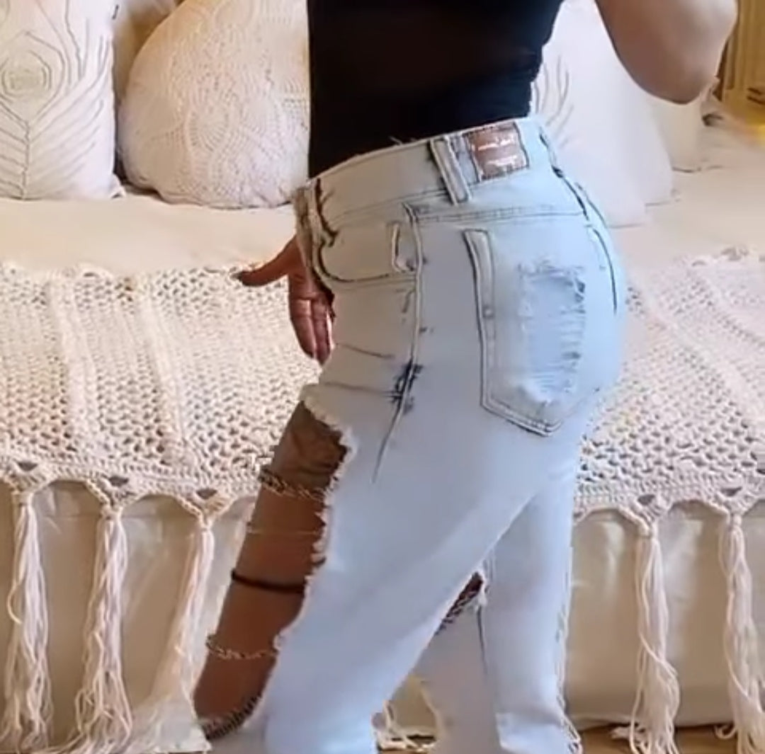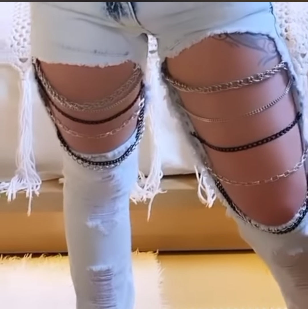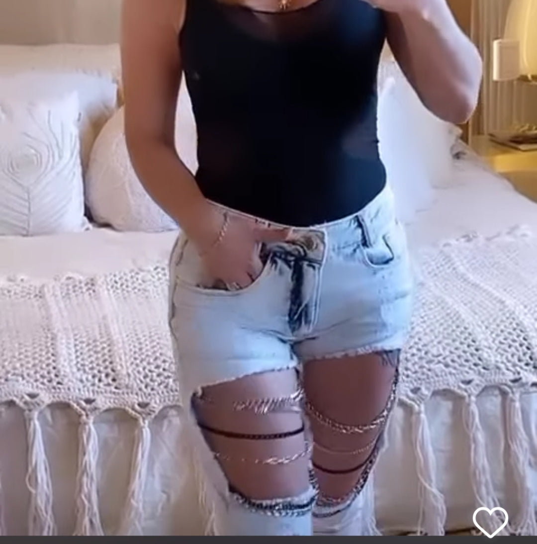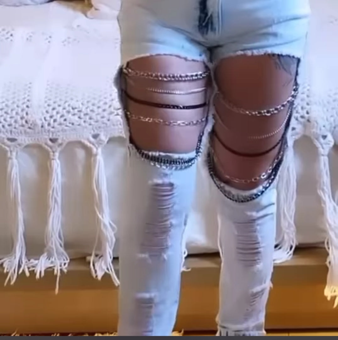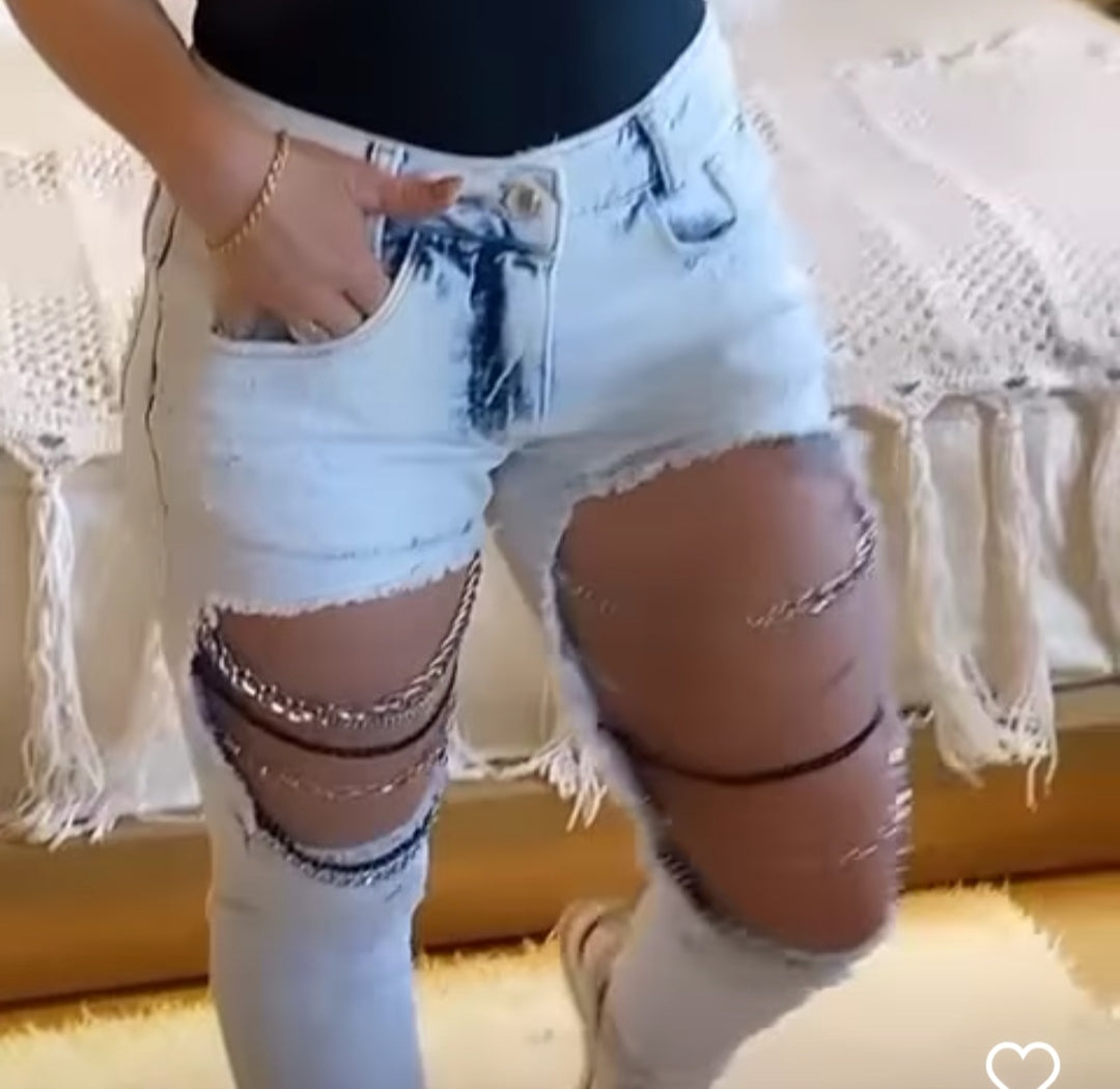 Calça em jeans com elastano com customizaçao frontal correntes que não enferrujam. Disponível na lavagem clara e escura