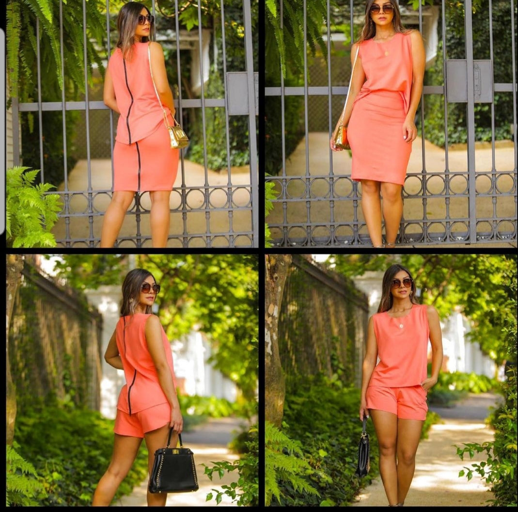 Conjunto 3x1 composto de blusa com zíper traseiro, saia midi com zíper traseiro  e shorts , lindo e diferente conjunto fresquinho em moletinho tecido com elastano caimento perfeito e estiloso .