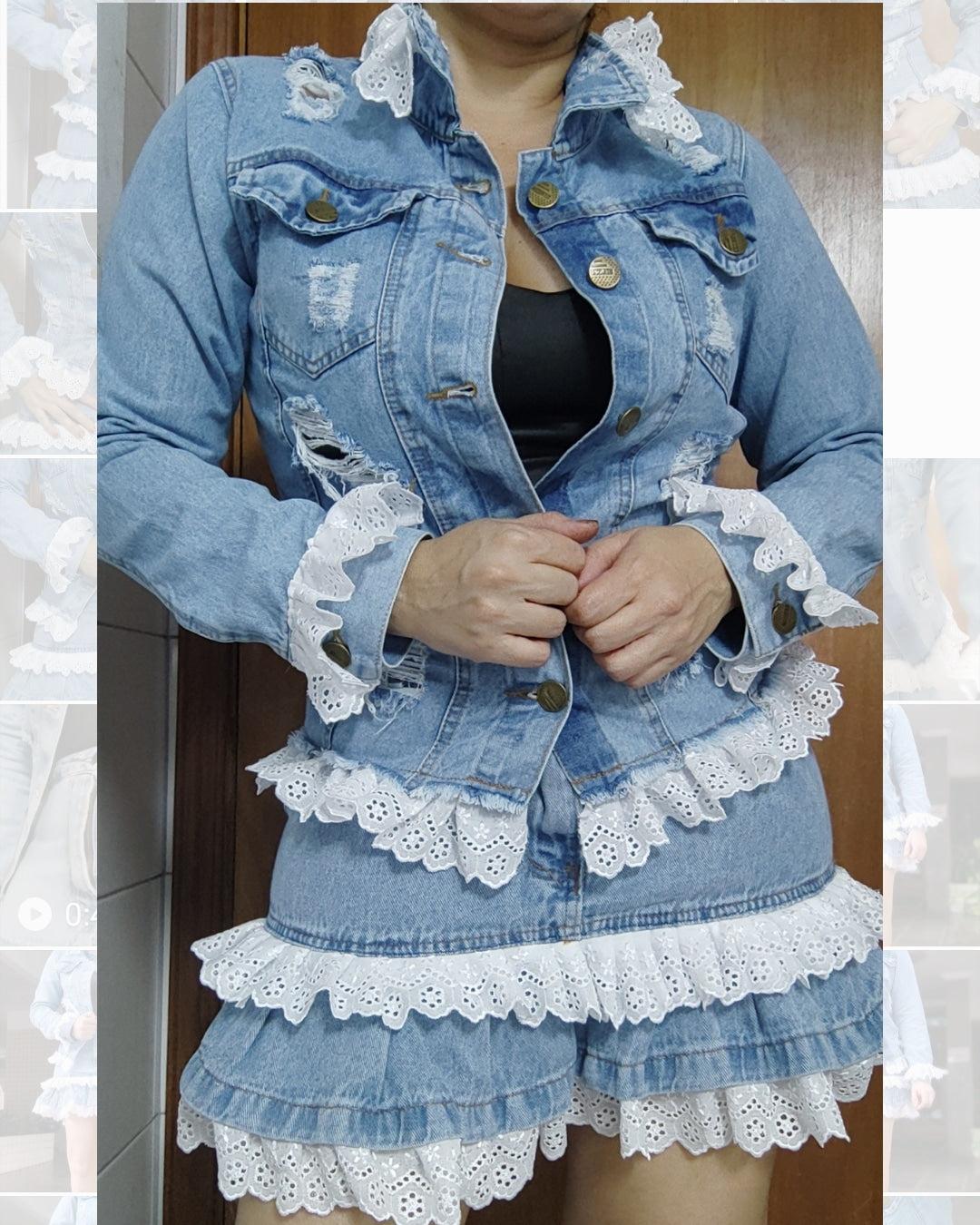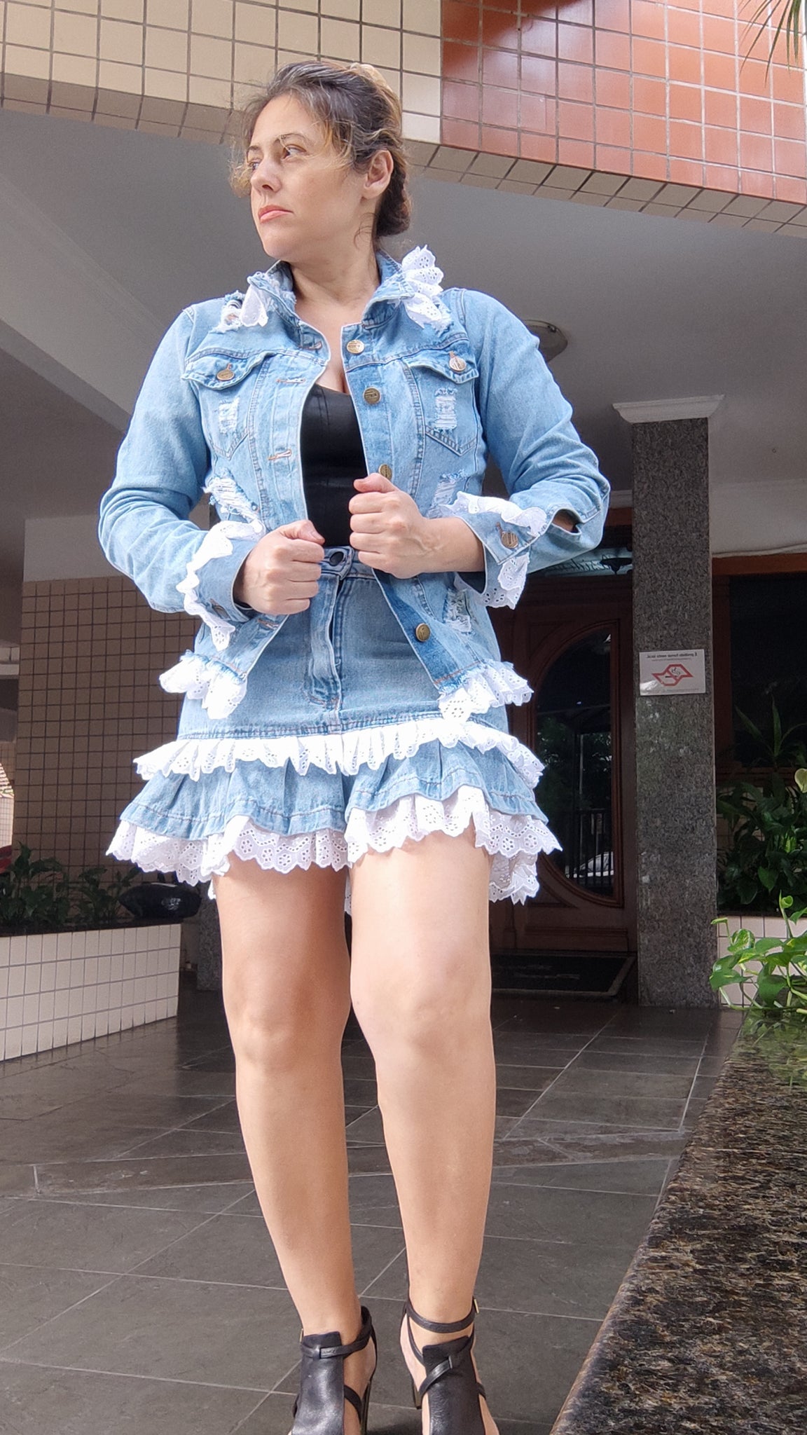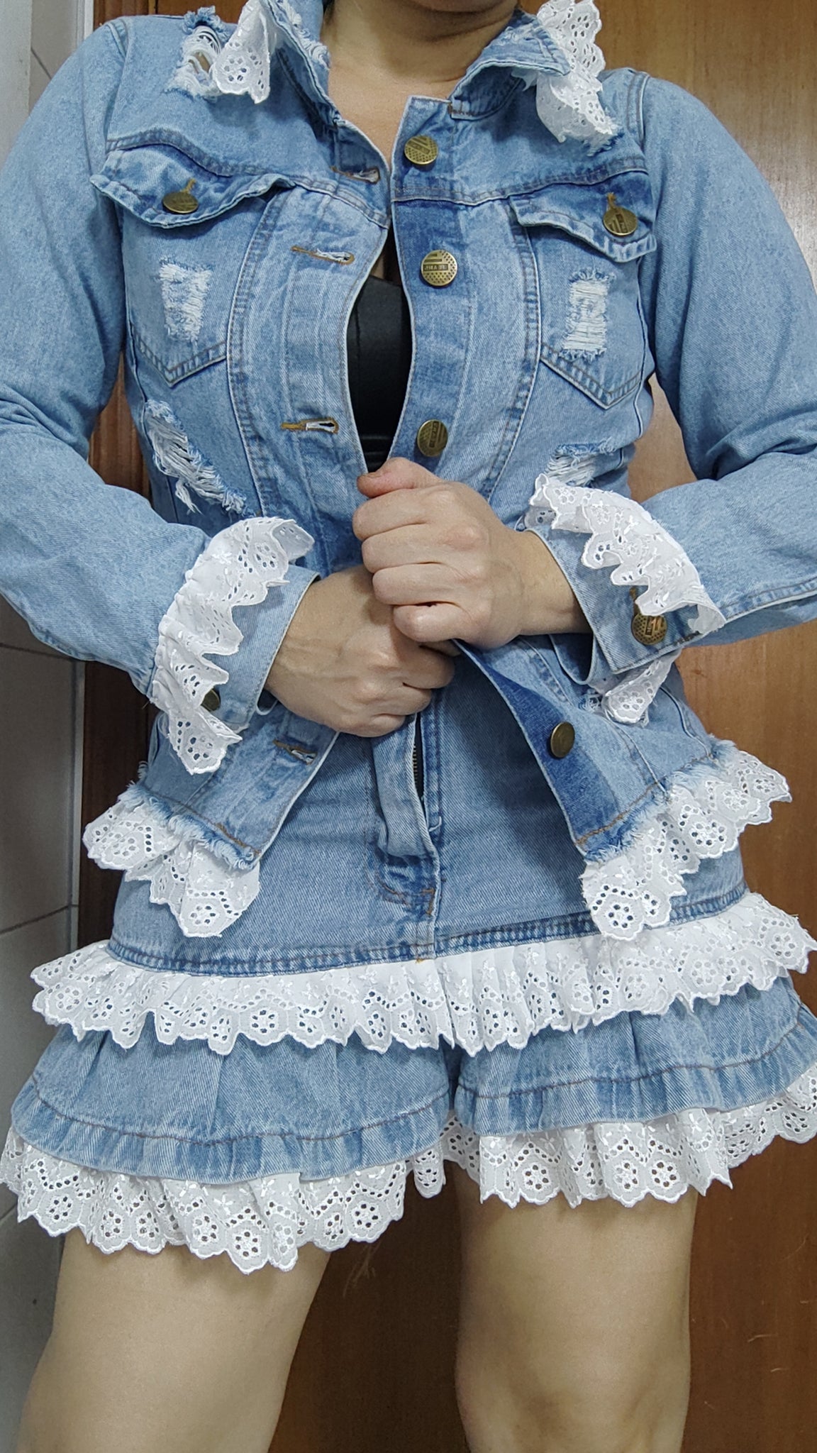 Conjunto em jeans sem lycra composto por jaqueta jeans com detalhes na barra , gola , mangas renda em algodão e saia jeans com babado em renda de algodão.