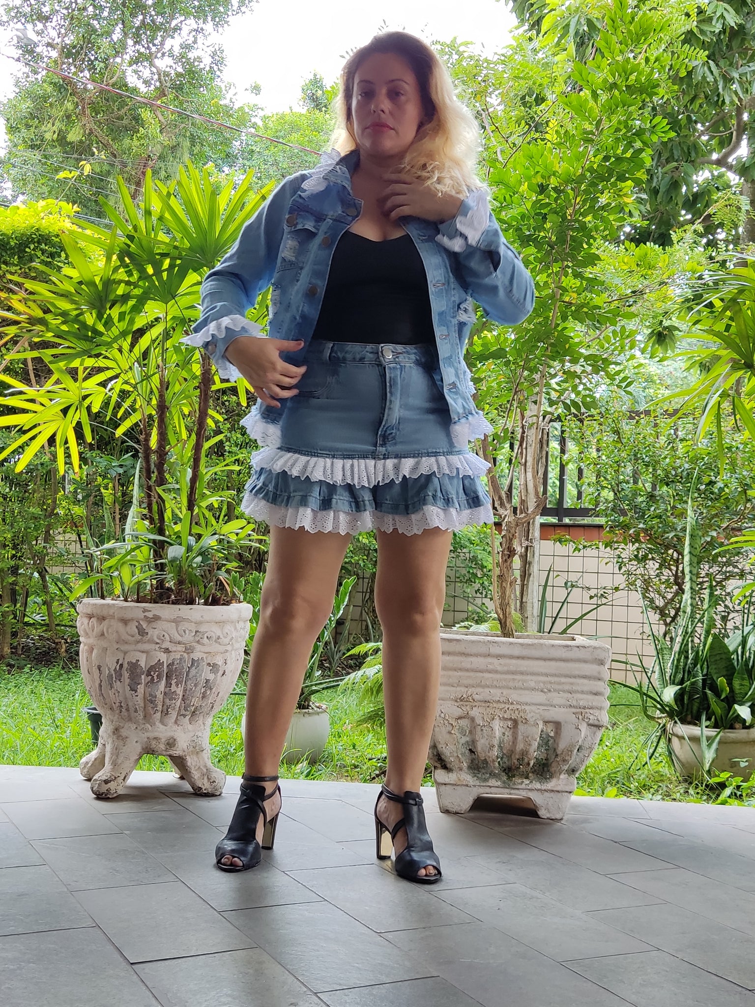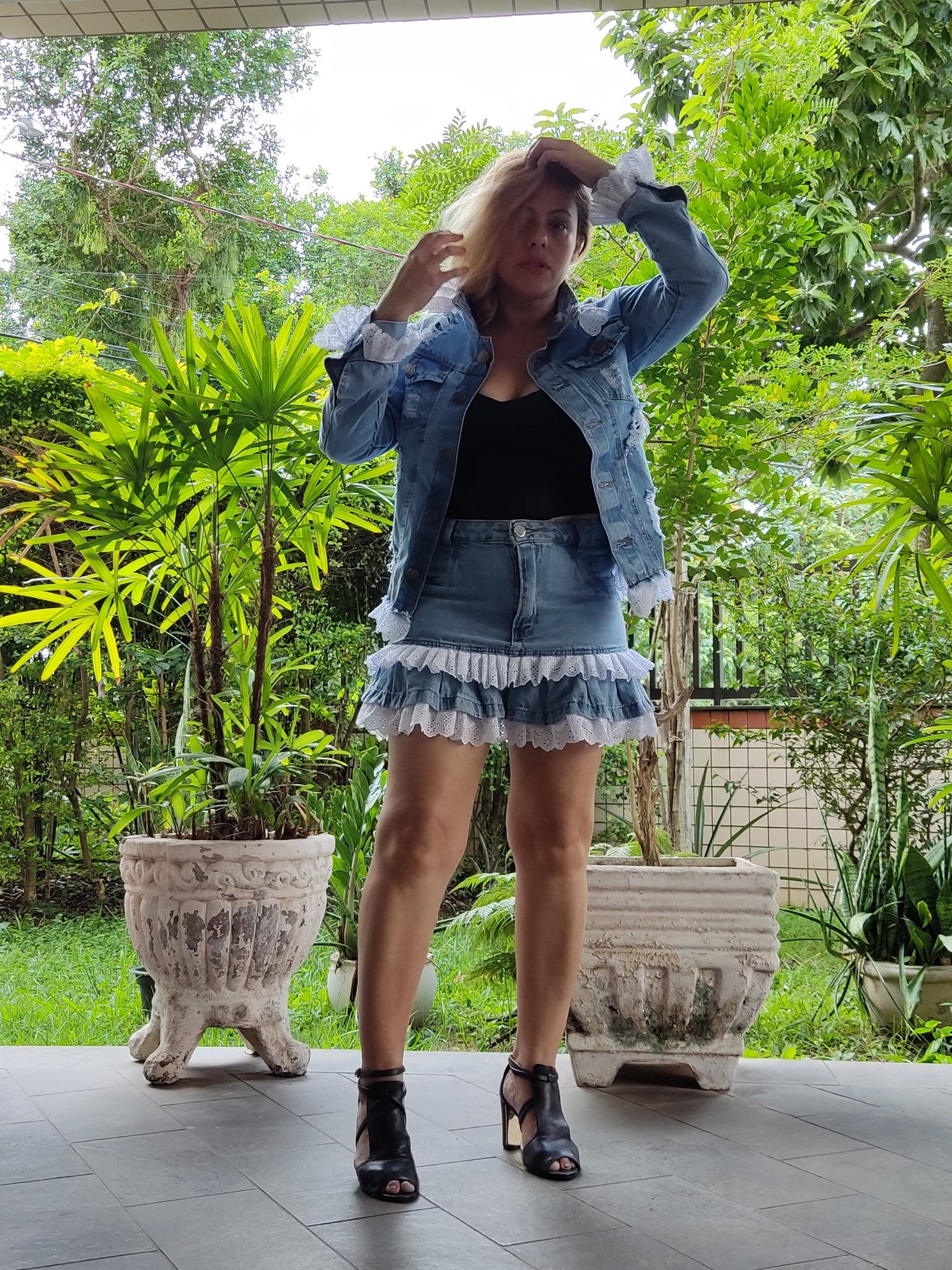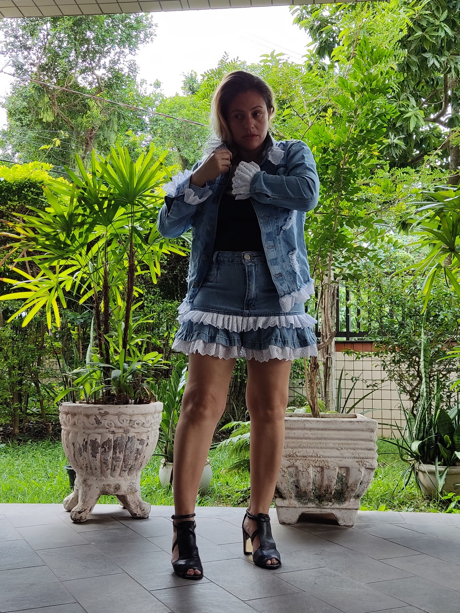 Conjunto em jeans sem lycra composto por jaqueta jeans com detalhes na barra , gola , mangas renda em algodão e saia jeans com babado em renda de algodão.