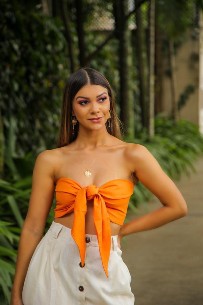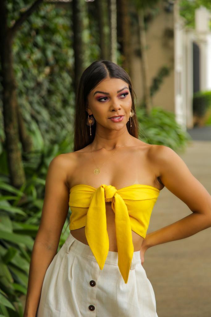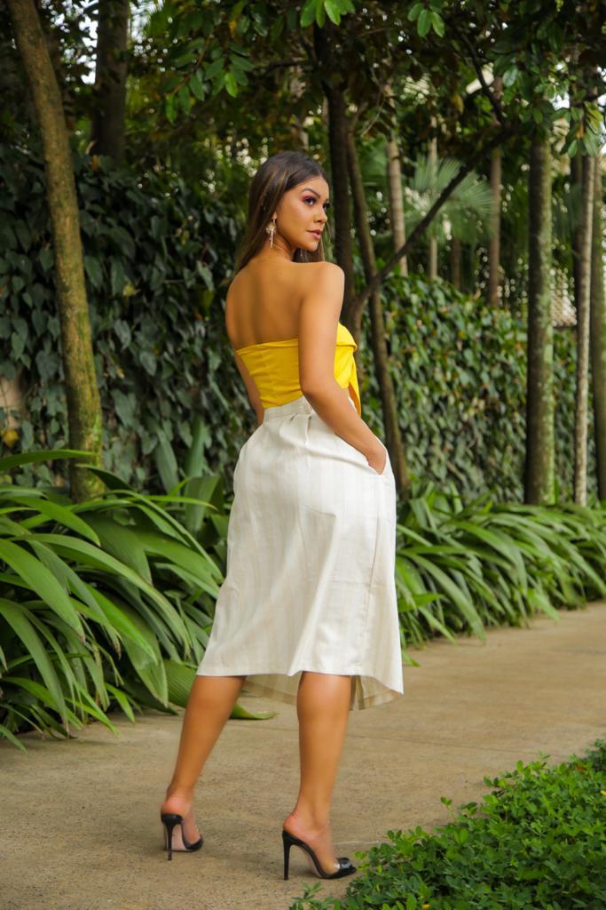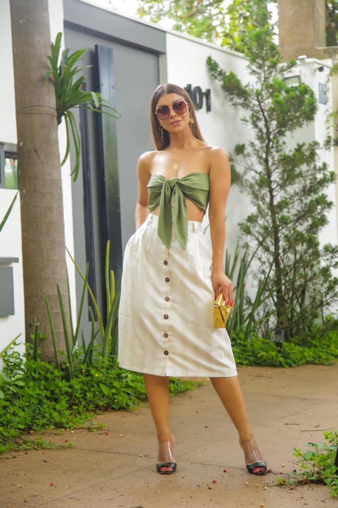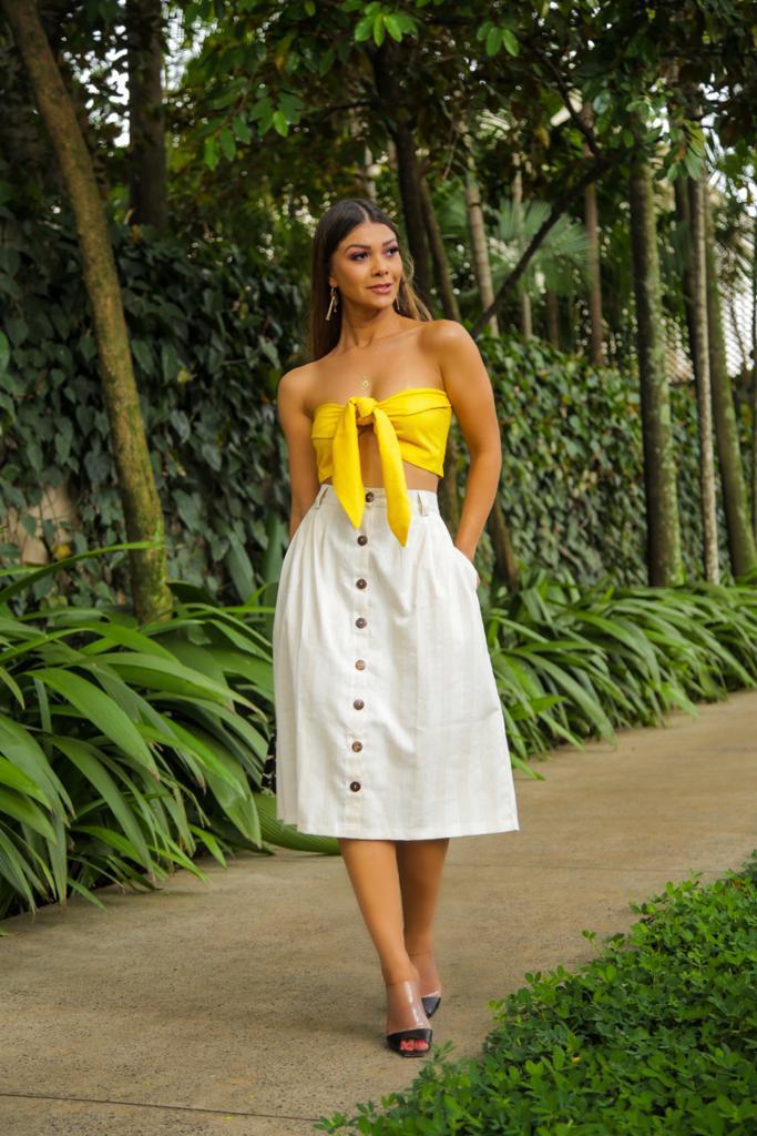 Conjunto em linho composto por cropped e saia midi com botoes frontais de cores vibramtes e a cara do verão. Disponivel do p ao g