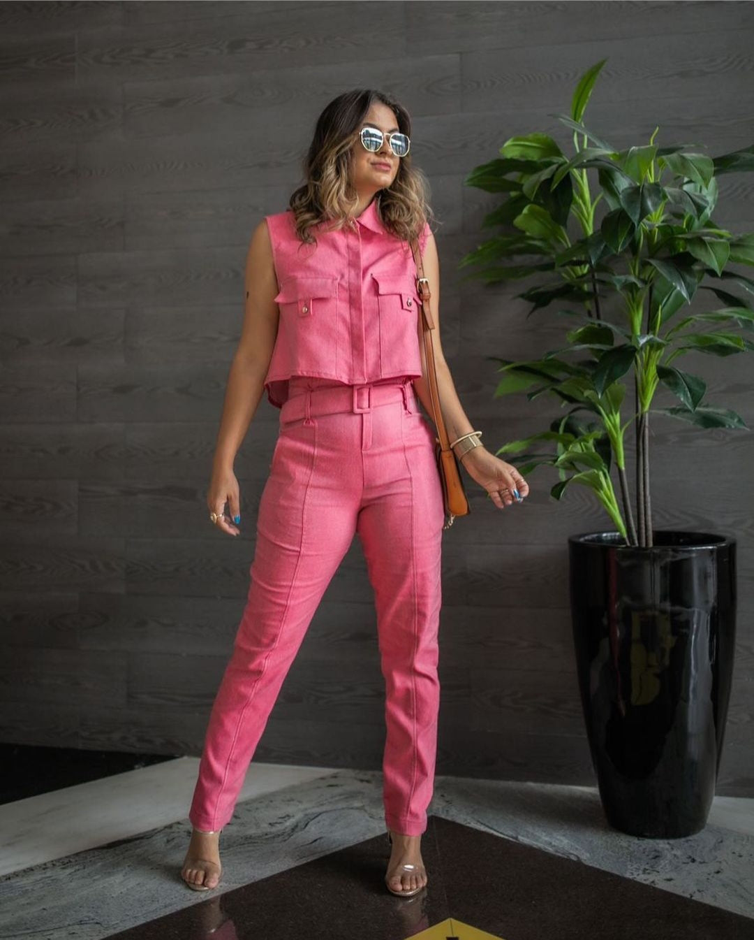 Conjunto em linho composto por cosa Mini crooped com botões frontais modelo regata e calça reta com Bolsos laterais . Modelo clássico e sofisticado