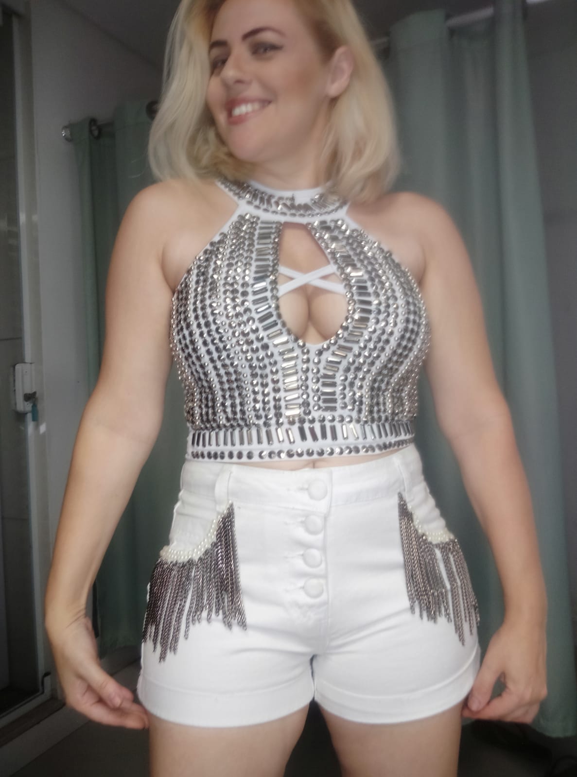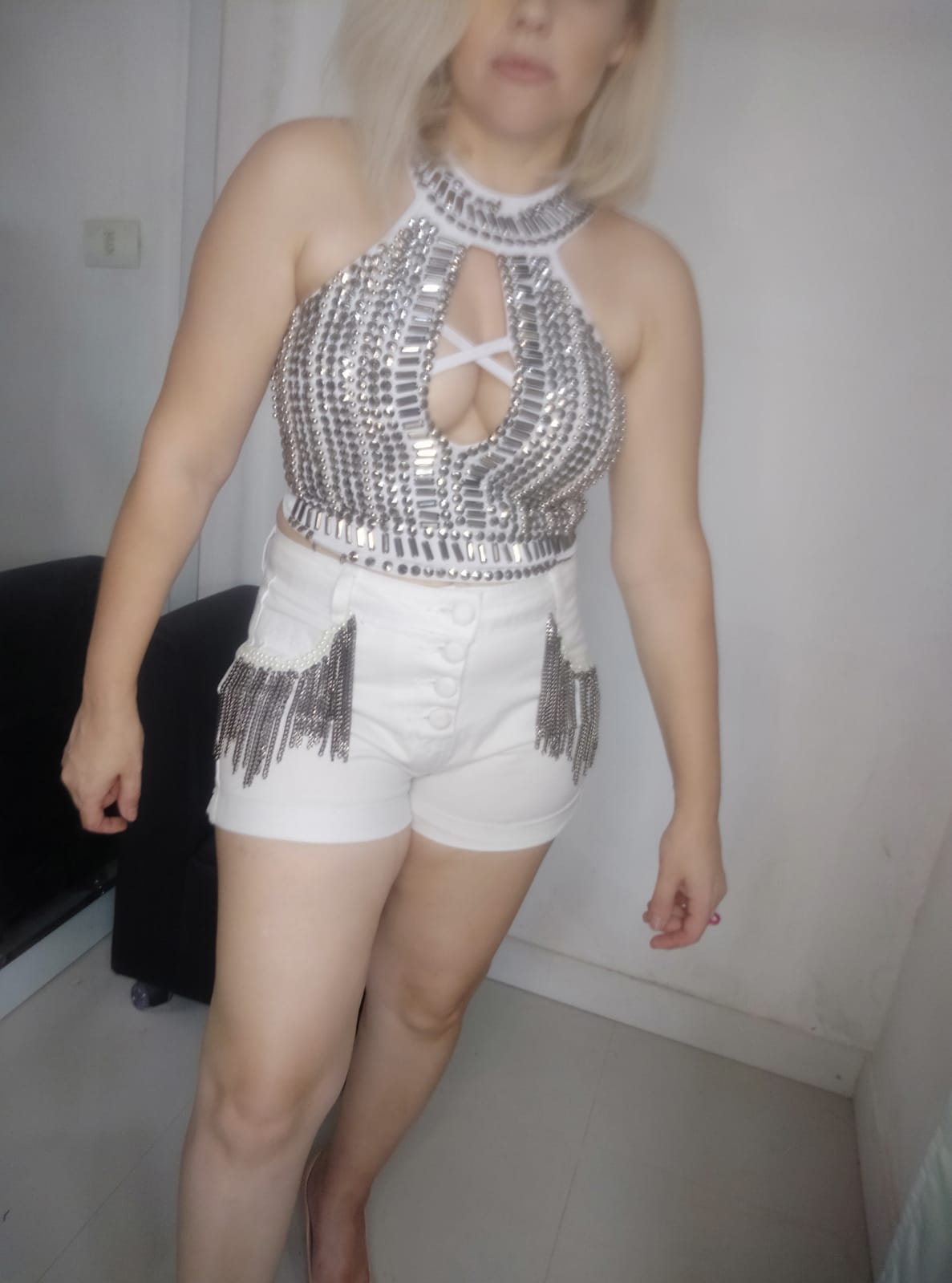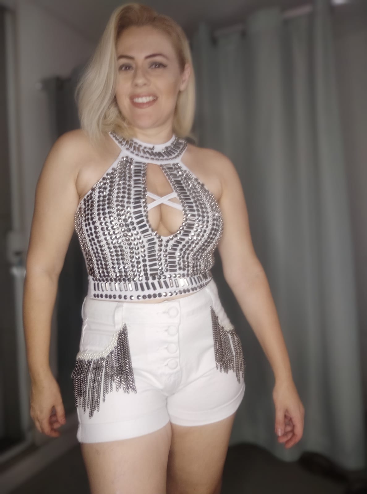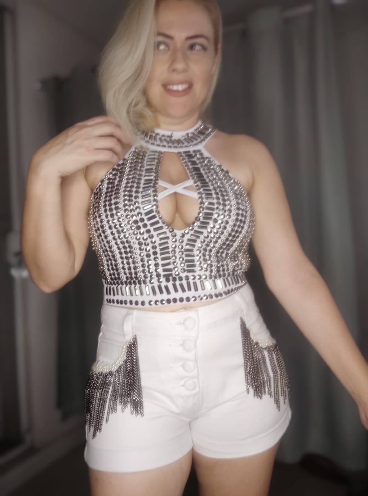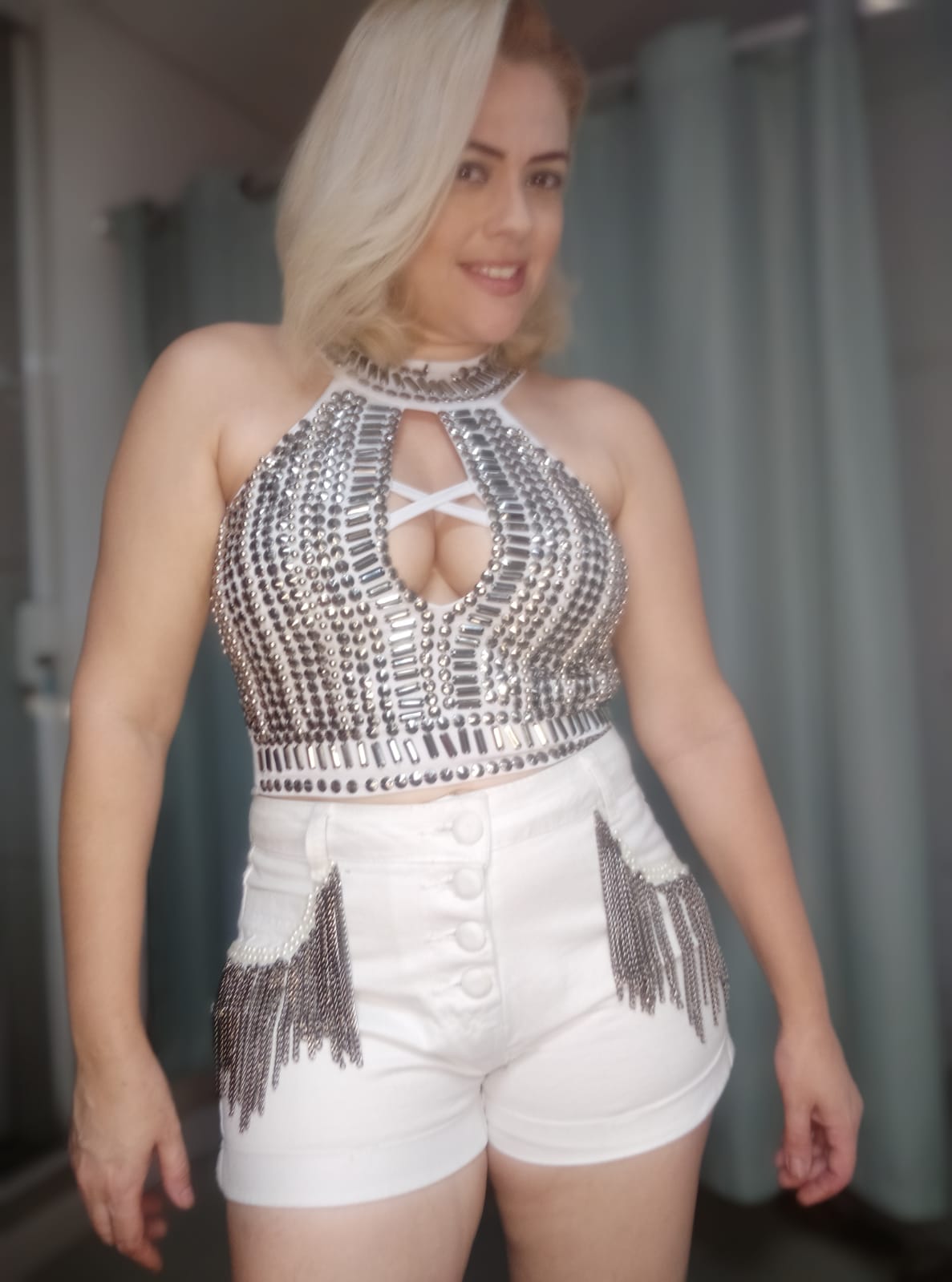 Conjunto composto por duas peças sendo elas 1 shorts jeans Sem elastano 100% algodão,customizado com correntes E pérolas aplicadas e Crooped em helanca Tecido com elastano bordado na parte frontal em taxinhas .