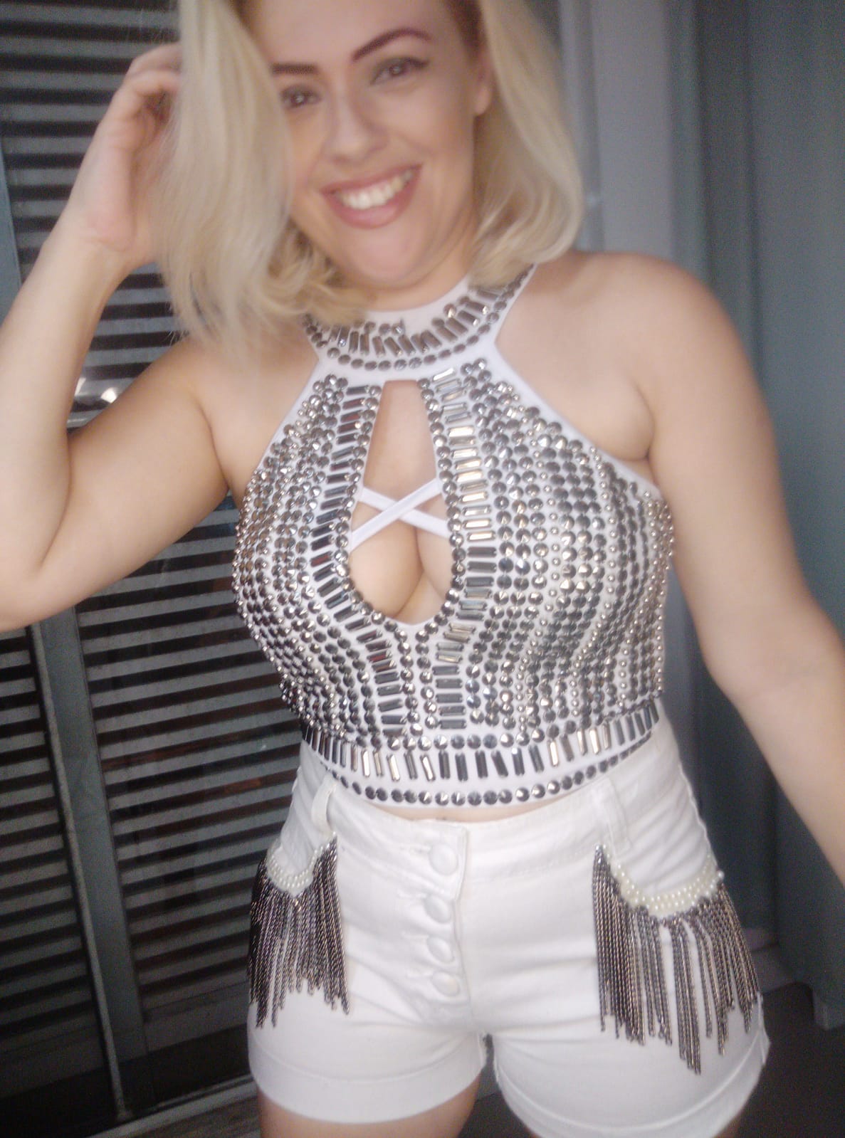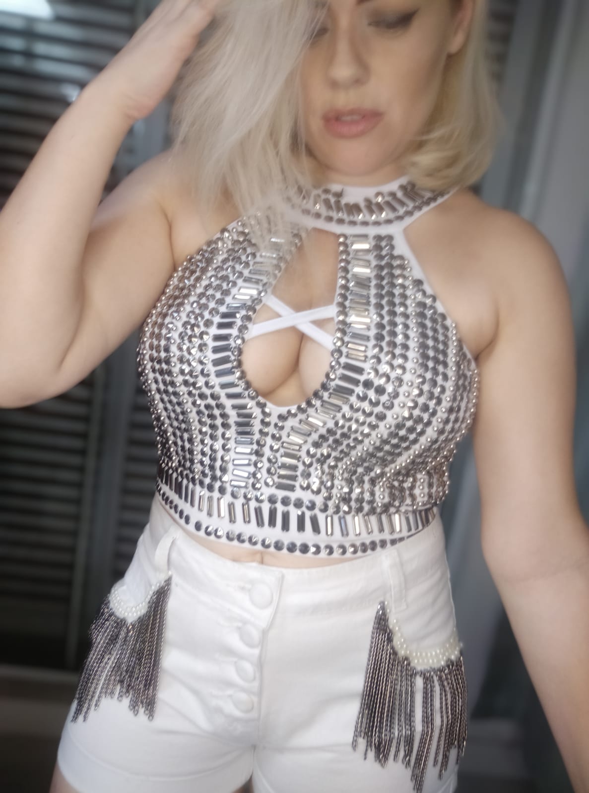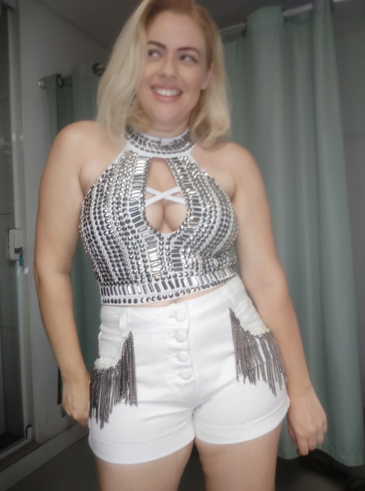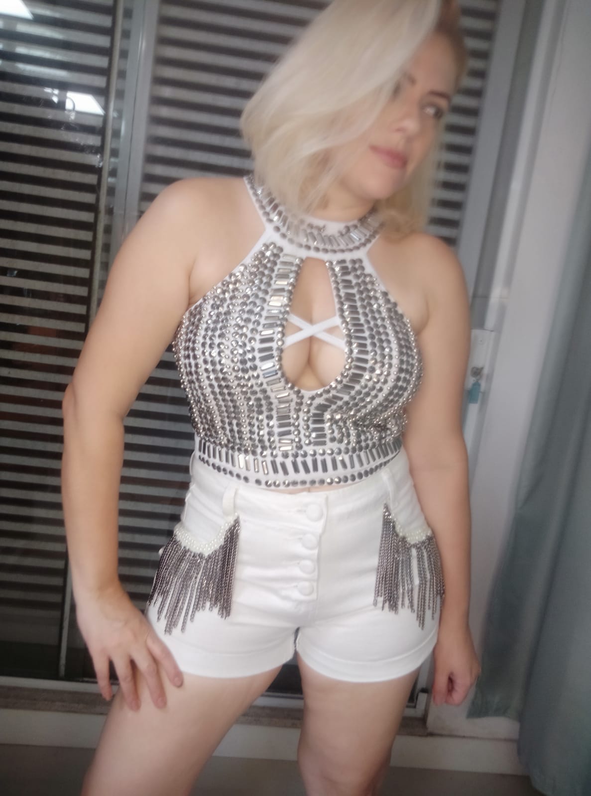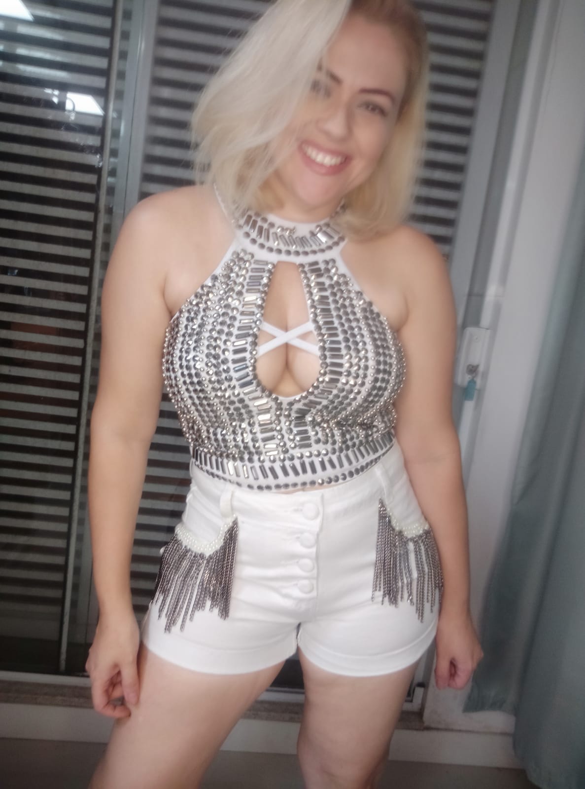 Conjunto composto por duas peças sendo elas 1 shorts jeans Sem elastano 100% algodão,customizado com correntes E pérolas aplicadas e Crooped em helanca Tecido com elastano bordado na parte frontal em taxinhas .