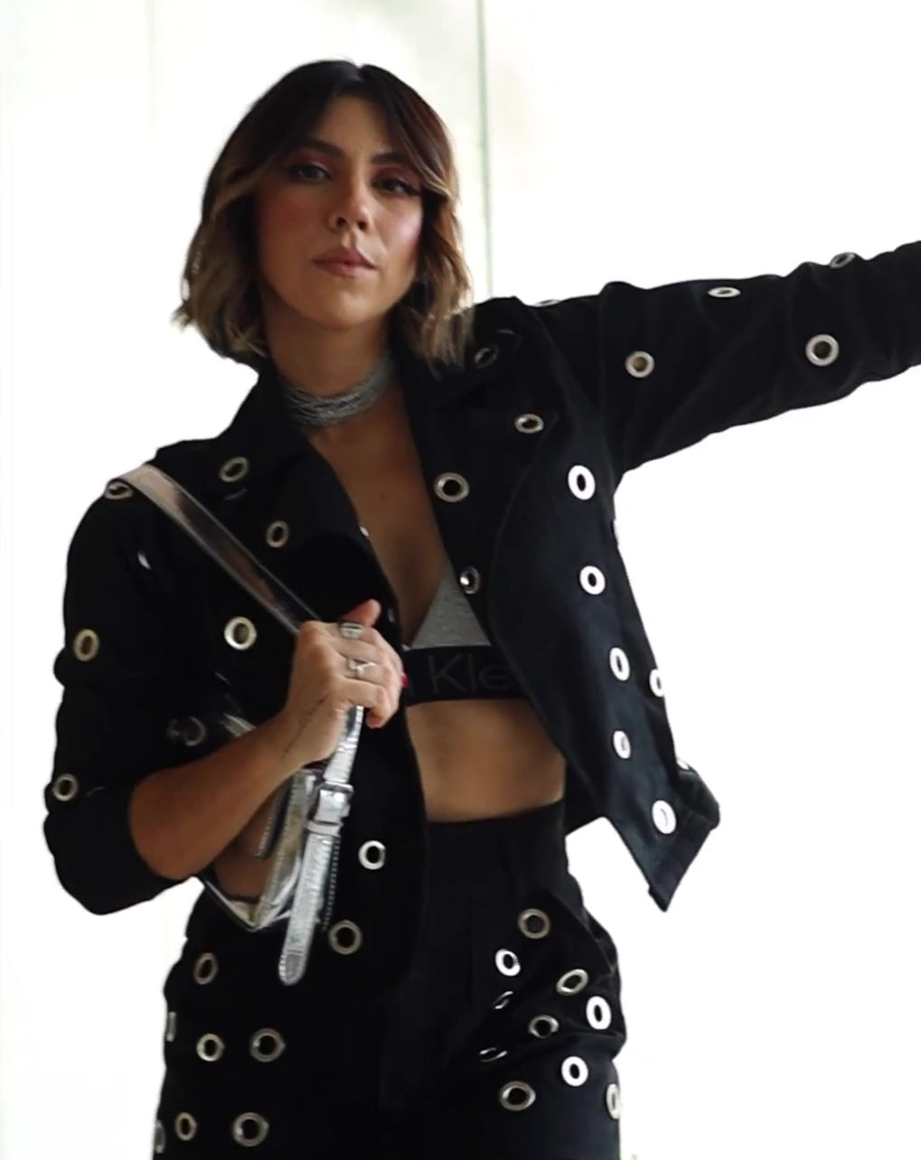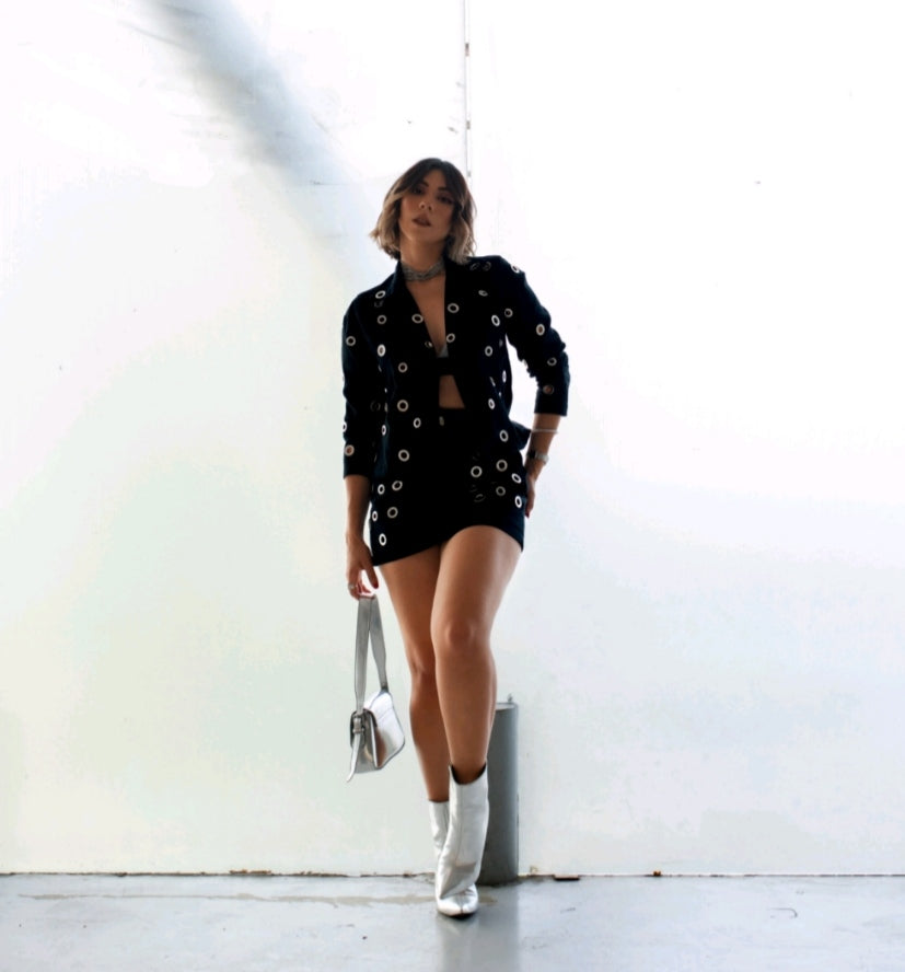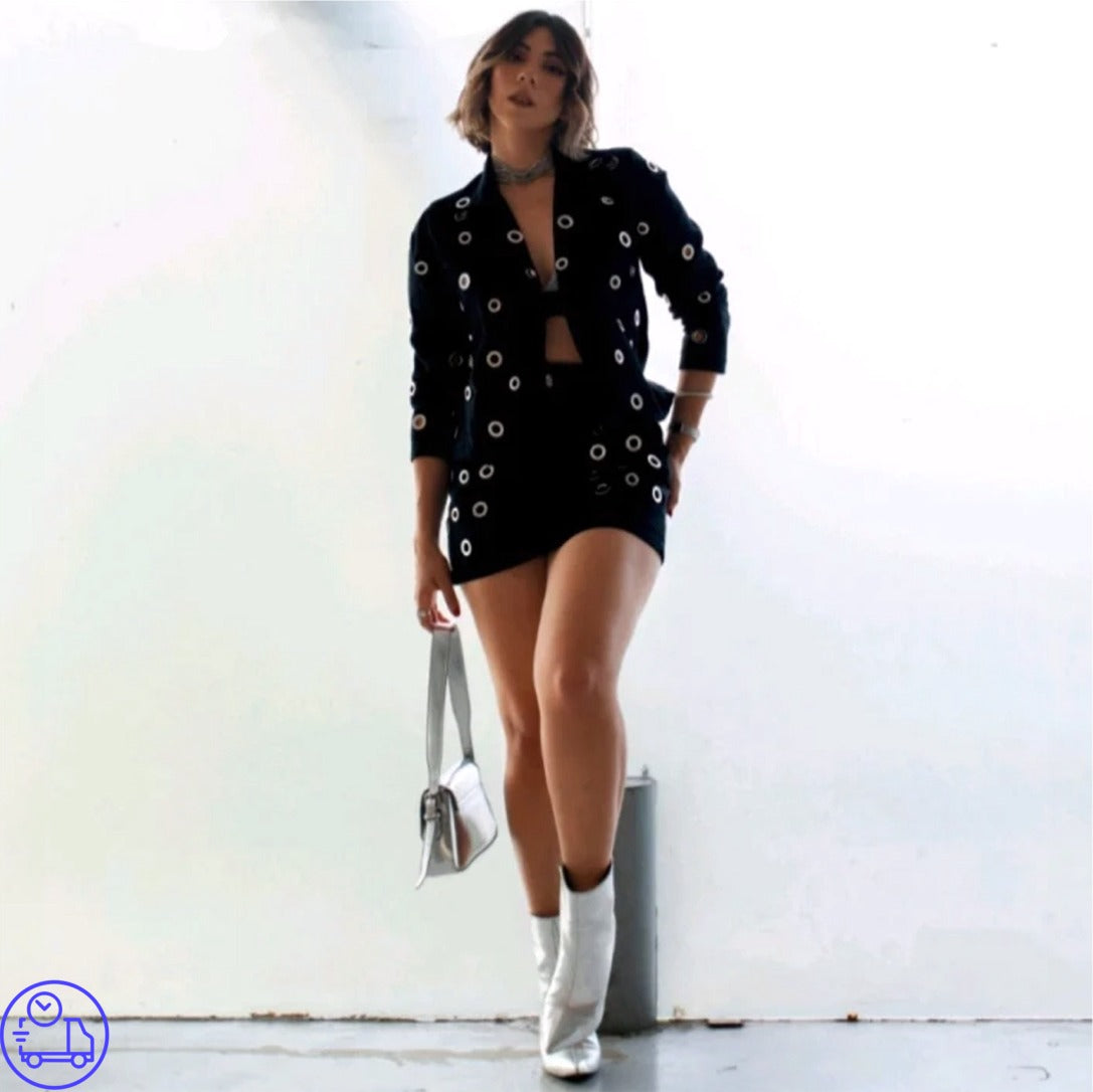 Conjunto em brim composto por duas peças , sendo saia sem lycra e jaqueta manga longa sem lycra , customizadas com ilhós frontal . Peças versáteis de muito estilo . Disponível do 36 ao 44 nas cores Preto, Bege e Cinza