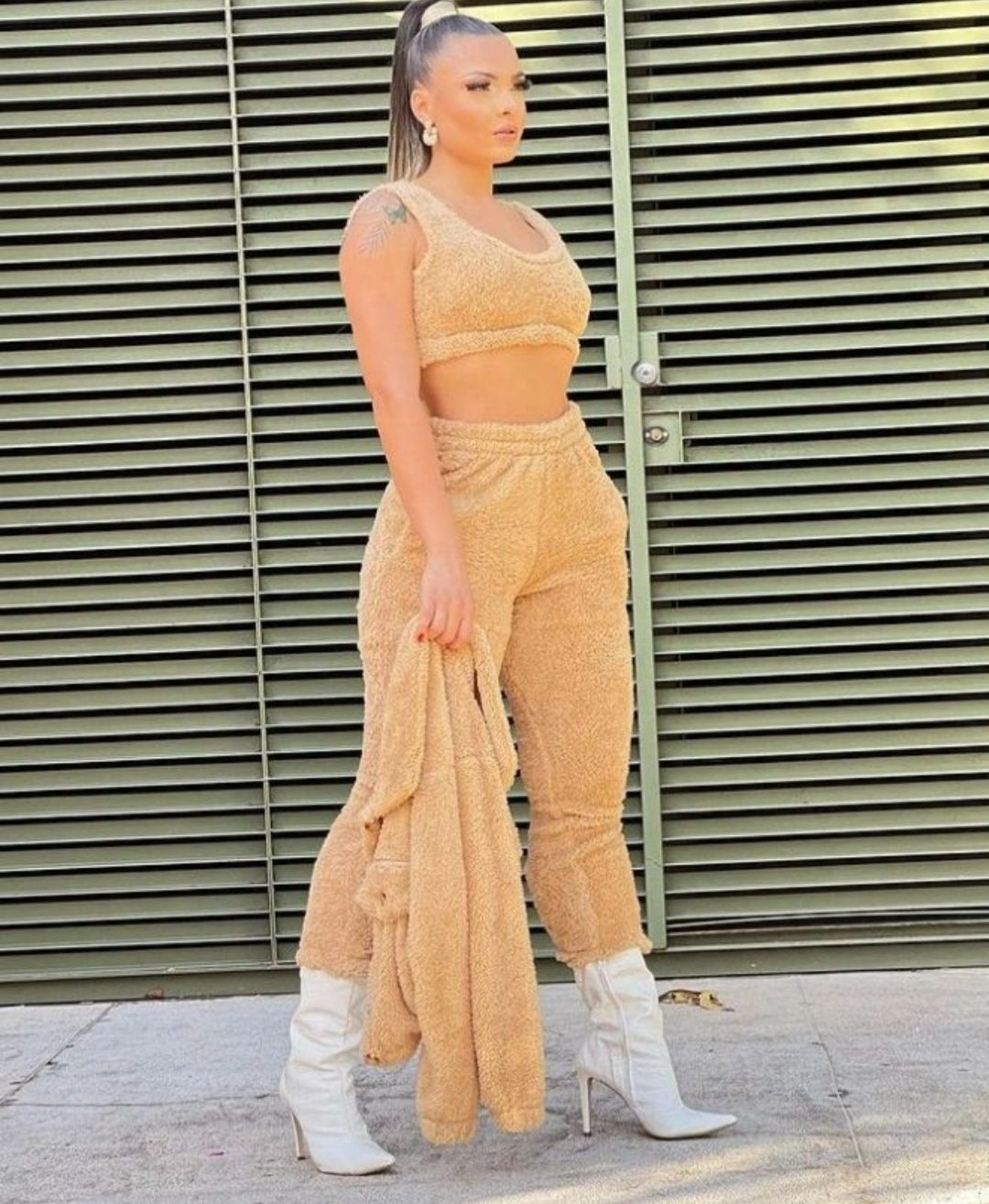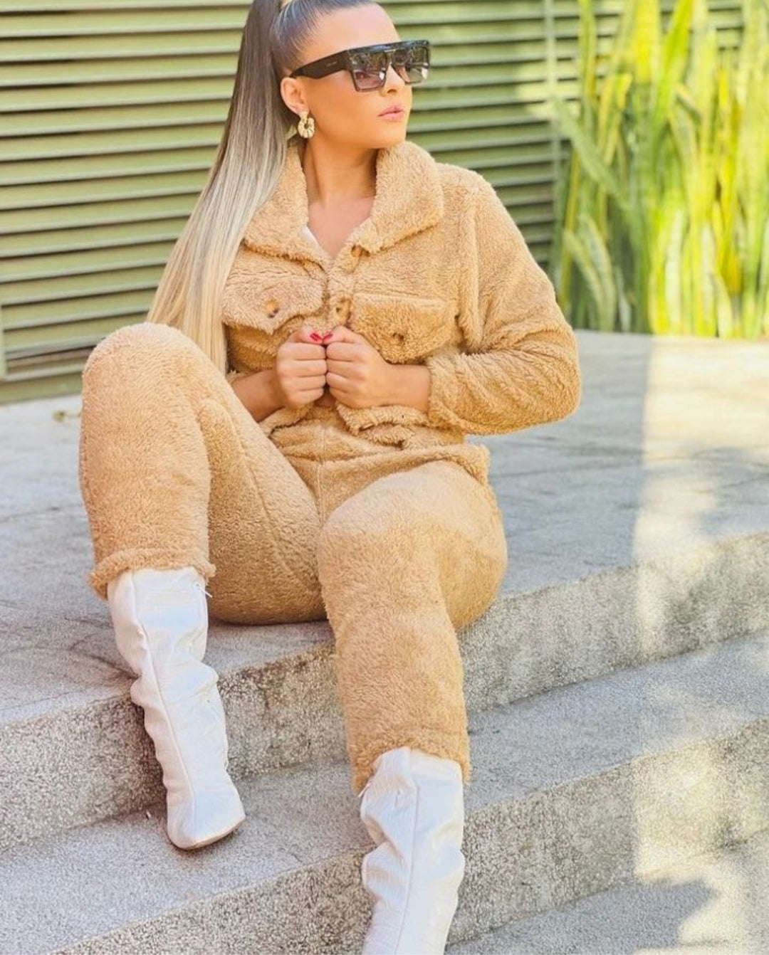 Conjunto tecido tedy felpudo leve com pouco, elastano, macio e confortável composto por crooped e calça