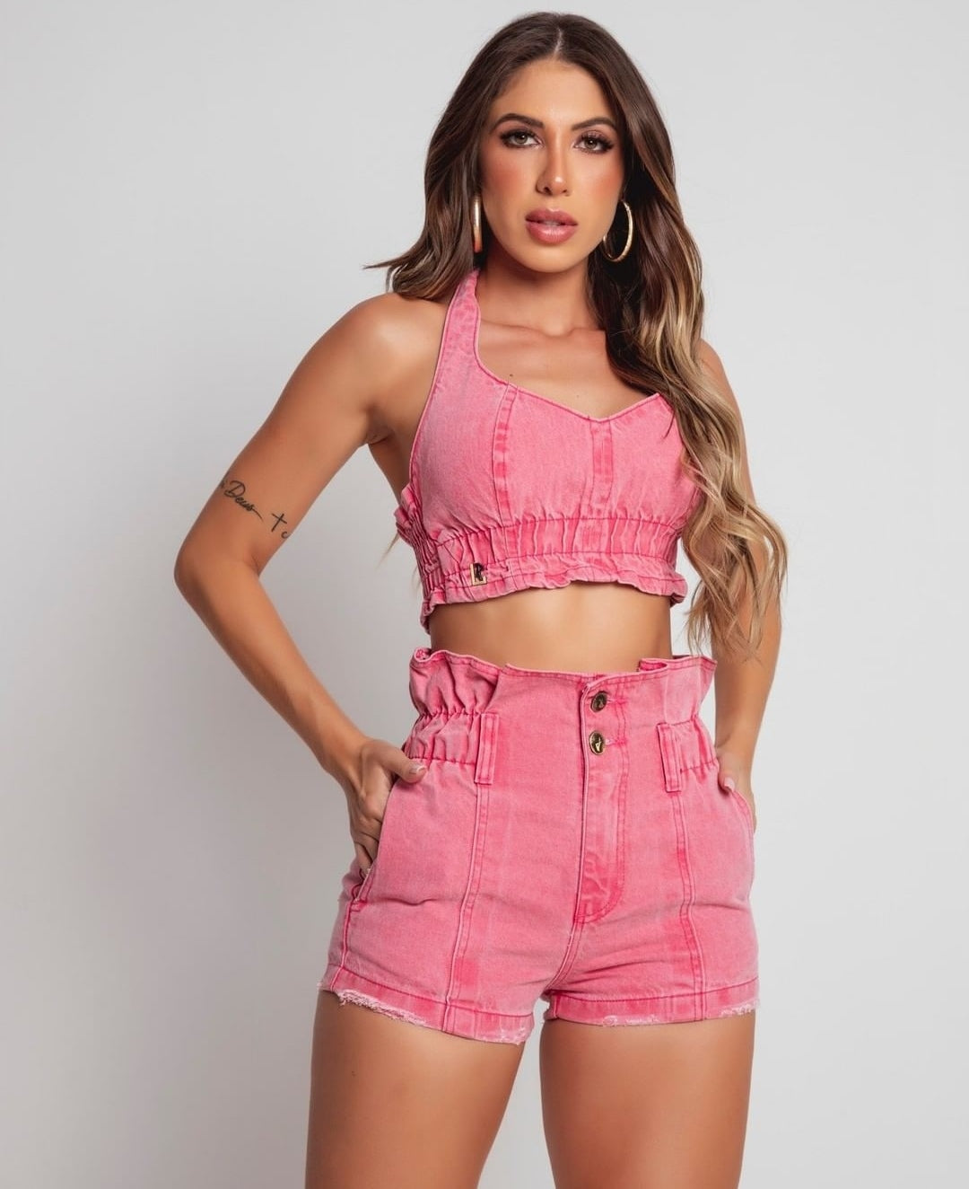 Conjunto em brim com pouco elastano 2%composto por crooped de amarração na altura do pescoço, e elástico na barra ,shorts cintura alta com elástico largo , bolsos laterais . Costura de melhor qualidade