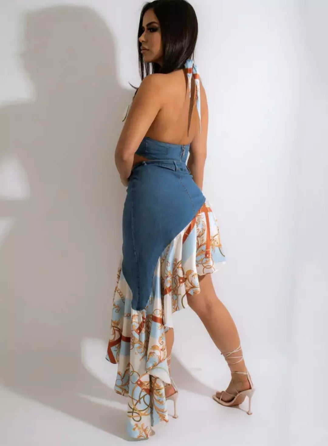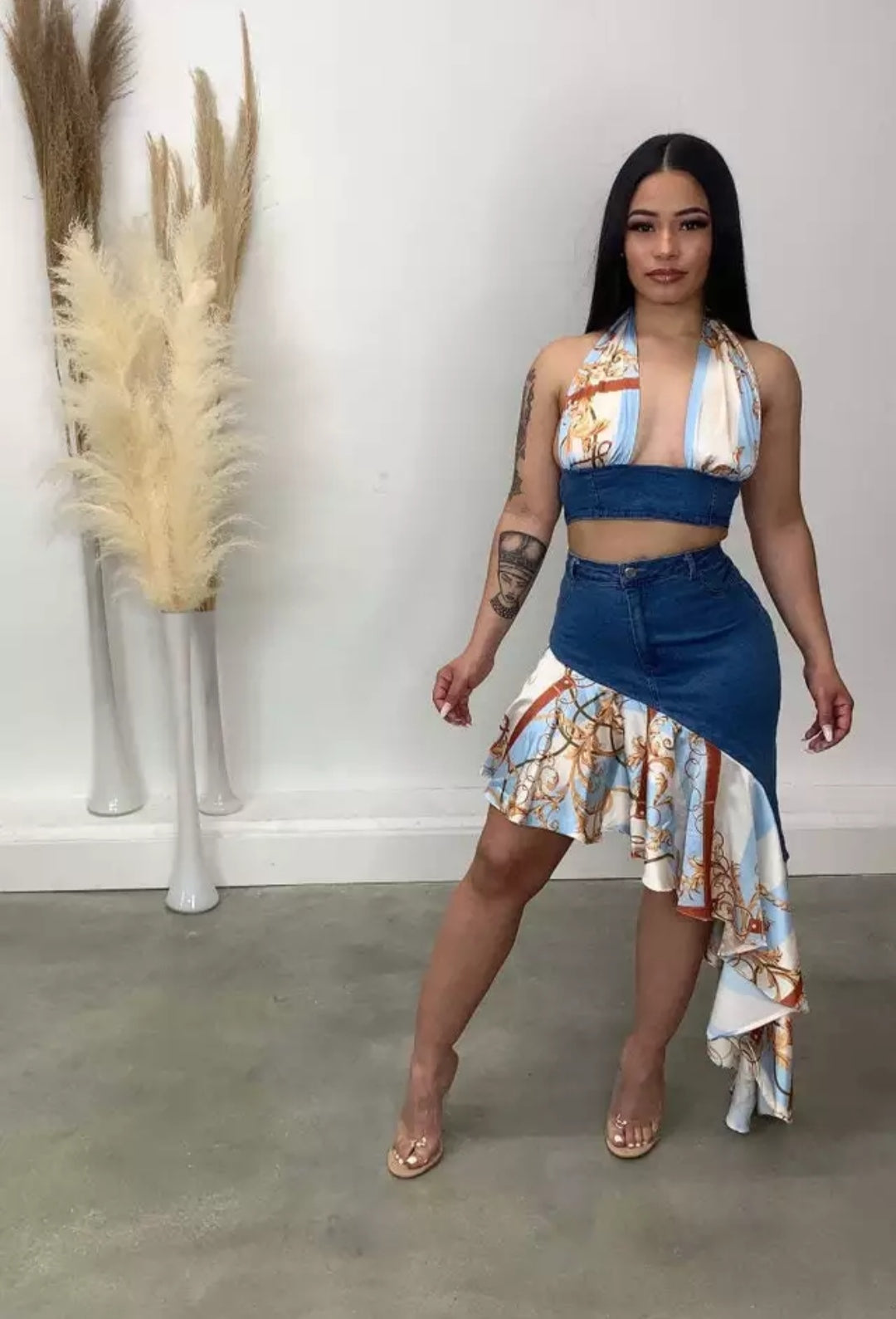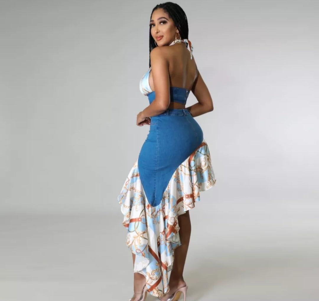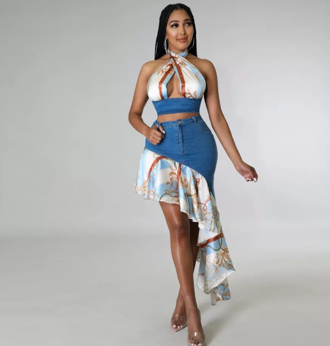 Conjunto jeans com elastano e cetim , composto por saia jeans modelo mullet e barraca plissada em cetim e Crooped gente única em jeans com cetim , amarração traseira , modelo produzido por pedido com envio de aproximadamente 15 dias uteis após a compra. Disponível do 34 ao 44 .
