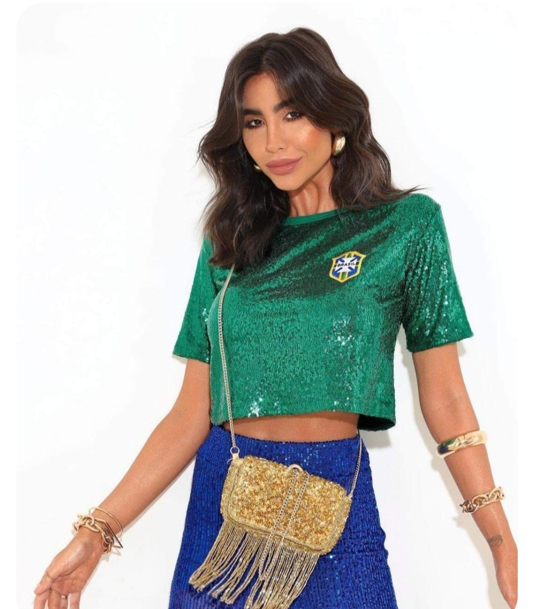 Conjunto tecido leve em paetê bordado com Lycra composto por 2 peças sendo 1 crooped, 1 shorts com elástico na cintura. Disponível nas cores verde, amarelo, azul e prata. Do tamanho 38 ao 44