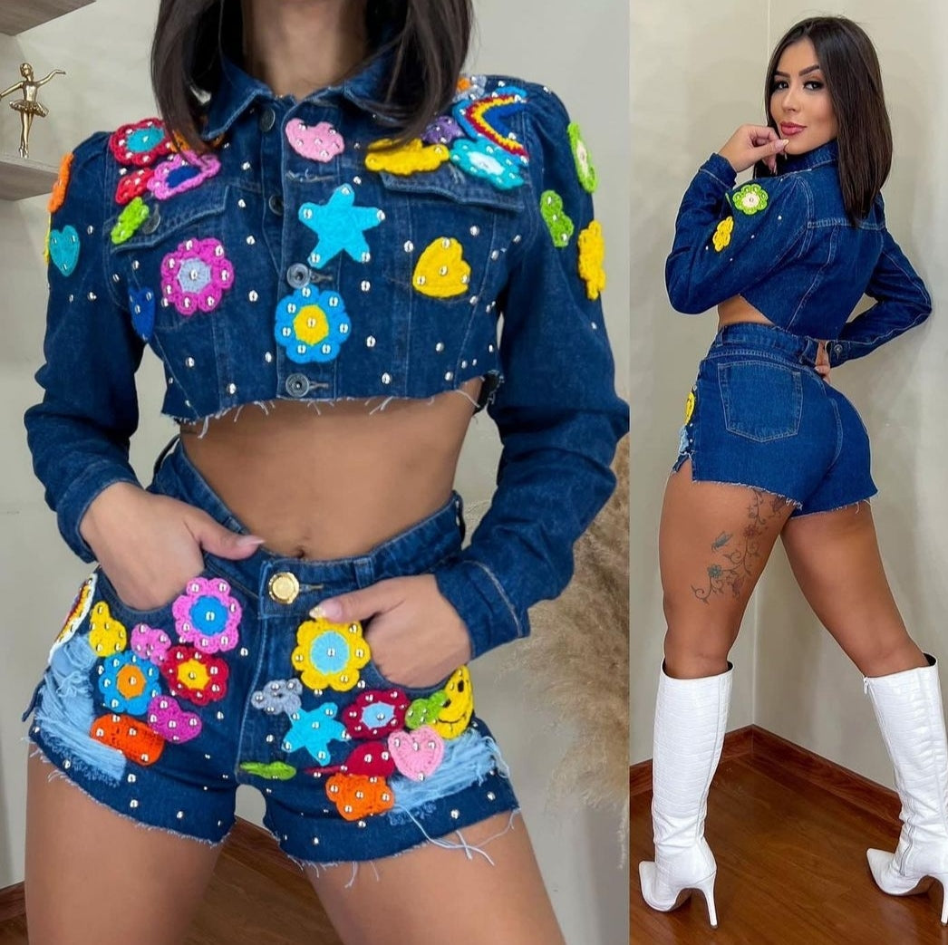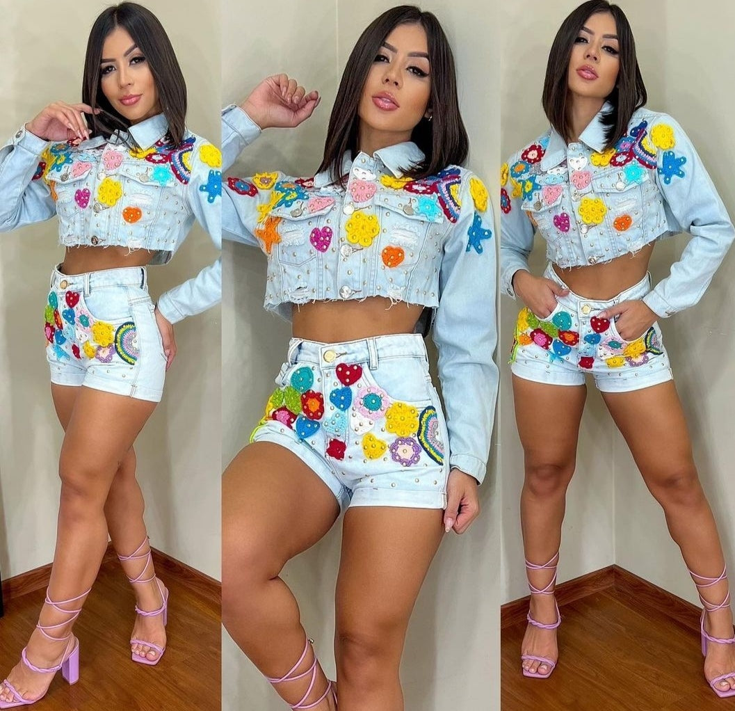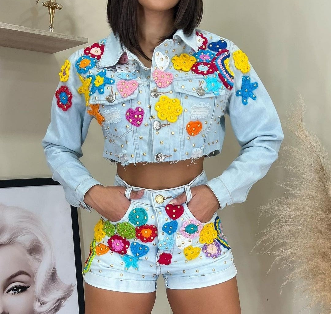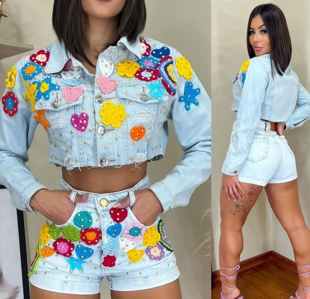Conjunto em jeans sem lycra , composto por 2 peças sendo elas 1 mini jaquetinha e 1 shorts  customizados  em crochê,rococó e taxinhas na parte frontal . Veste tamanho normal, disponível do 34 ao 44 (não acompanha Crooped)