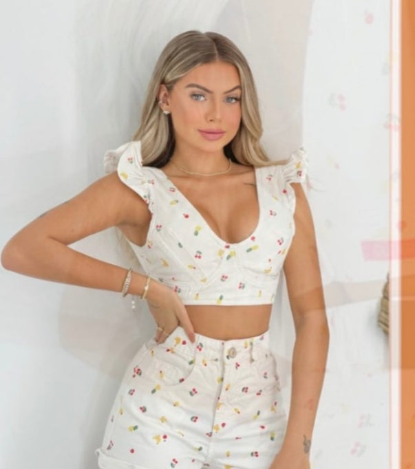Conjunto em brim sem elastano composto por crooped manga regata babado e shorts modelo moon bordado em linha . Não solta veste bem