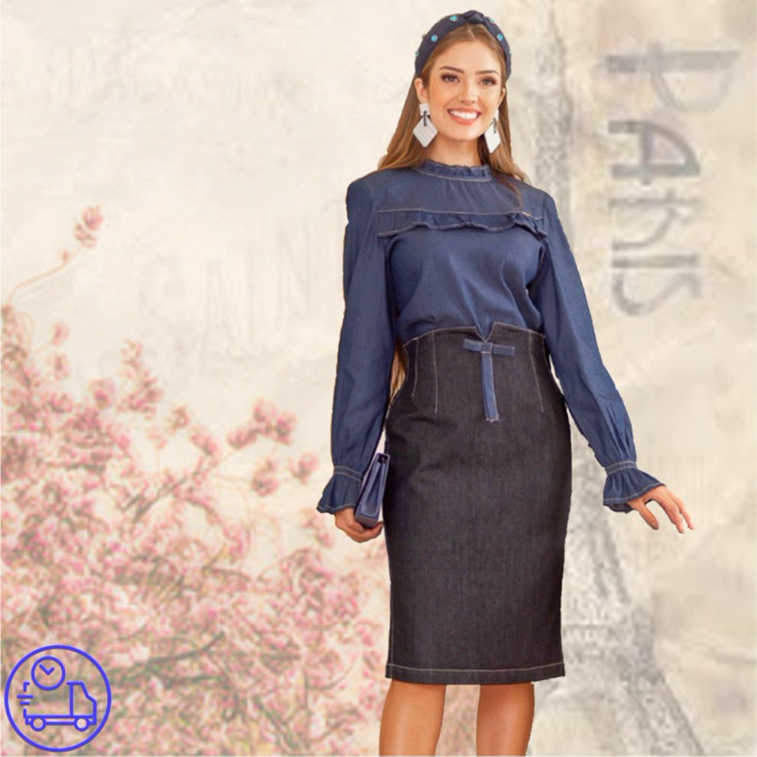 Lindo conjunto em jeans camisa leve mangá longa super charmosa e uma saia tubinho com leve elastano no modelo midi, um verdade luxo.