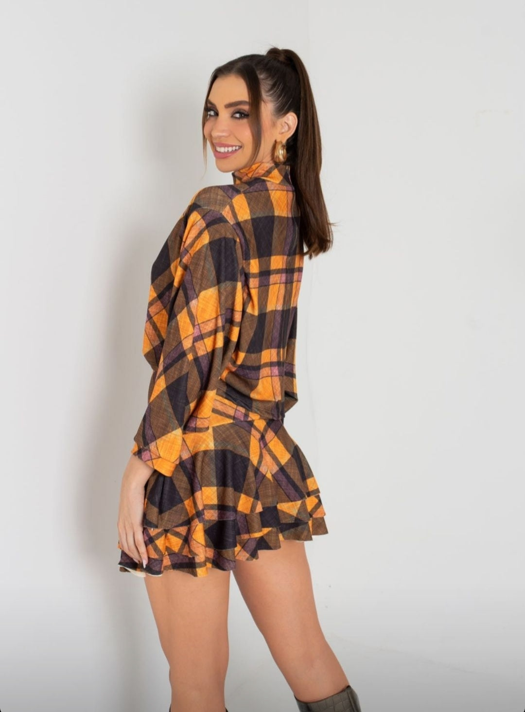 Saia curta composta por 3 babados e com zíper na lateral.