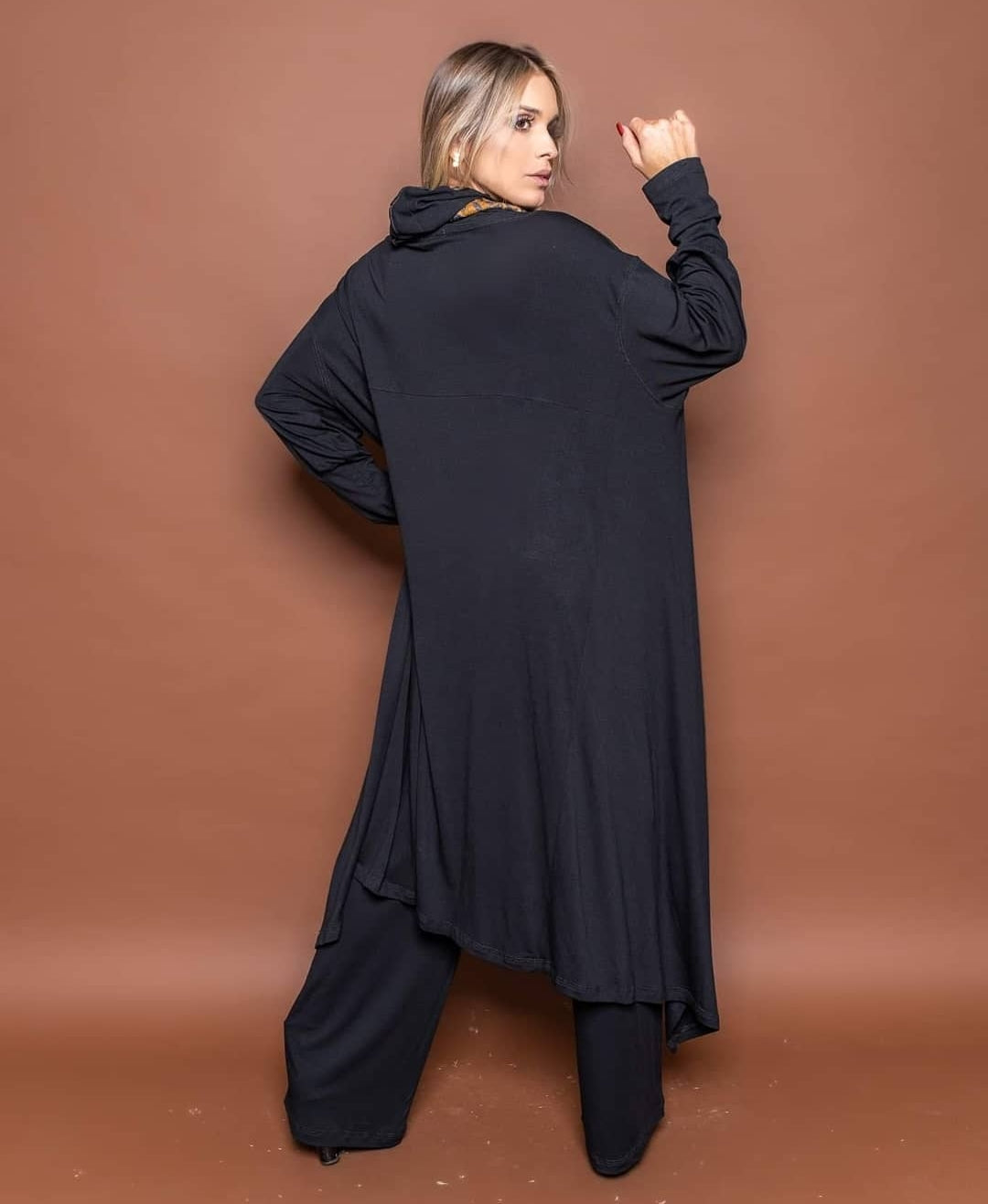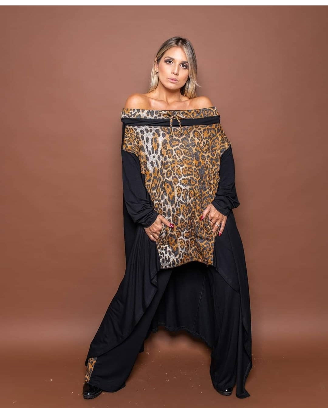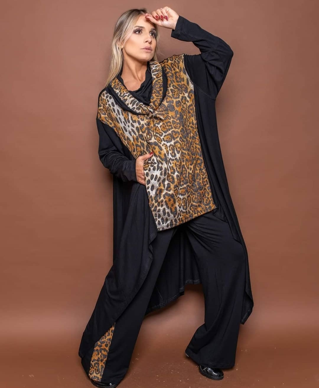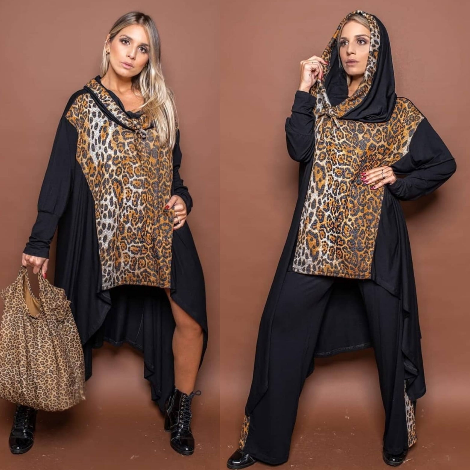 Conjunto em malha fria de alta qualidade camisa com capuz e detalhes em animal print que pode ser usado também como Vestido e calça com detalhe lateral em animal print. Super moderno. Veste do 36 ao 48.