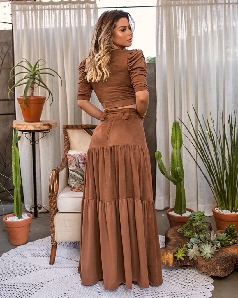 Conjunto em Suede composto por crooped decote v com manga bufante e saia longa Duas Marias com zíper de abertura traseira , tecido fresco e com caimento perfeito , leve e sofisticado podem ser usados separadamente .