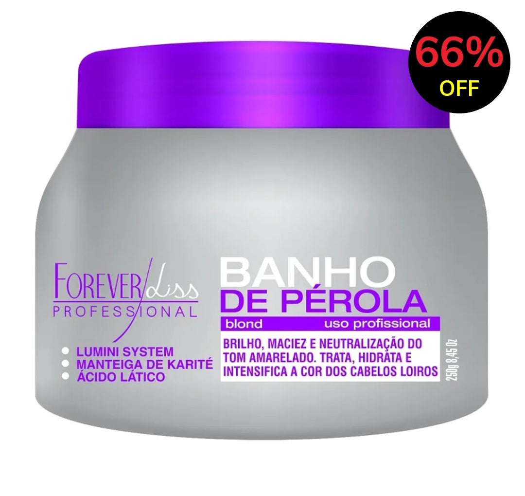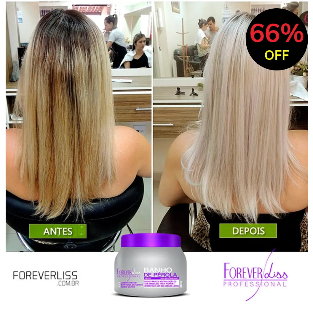 A Forever Liss sempre revoluciona criando os melhores produtos capilares, depois do sucesso do Banho de Verniz a empresa desenvolveu através dos Experts da Beleza Profissional o Banho de Pérola que promete ser o Creme das Loiras!Forever Liss Banho de Pérola é uma Máscara Hidratante e intensificadora da cor dos cabelos loiros com ação desamareladora, sua fórmula desenvolvida com tecnologia de ultima geração exclusiva Forever Liss possui Lumini System, Manteiga de Karite, Ácido Latico que age instantaneamente a fim de Hidratar, regenerar e nutrir profundamente os fios neutralizando os tons amarelados. O Banho de Pérola mantem a cor loira radiante e luminosa por um longo período, deixando o cabelo hidratado, livre do amarelado e cheio de brilho.Se transforme numa loira Radiante com um cabelo super macio e hidratado com o Banho de Pérola Forever Liss.