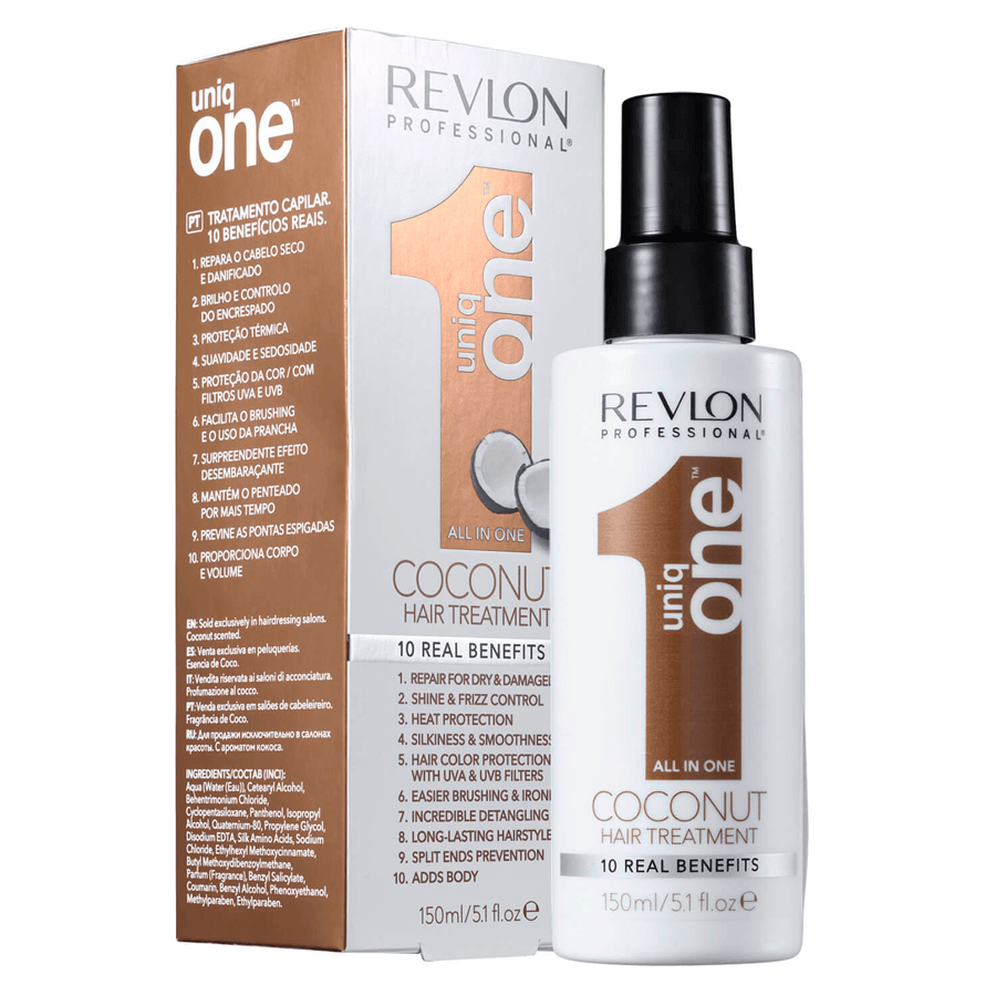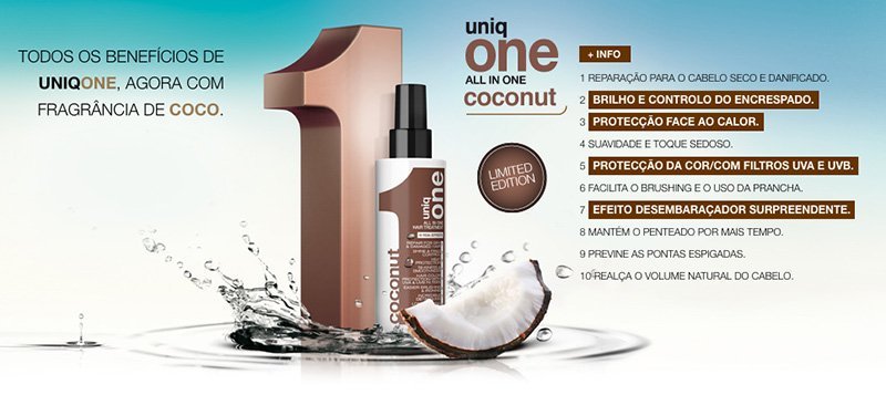 Descrição : Vencedor do Prêmio Especial Inovação da revista Nova/Cosmopolitan, ele é realmente uma revolução em matéria de cuidados para os cabelos. O Uniq One, da Revlon Professional, une 10 benefícios de tratamento e finalização em um só produto. Tem uma leve fragrância de coco.
