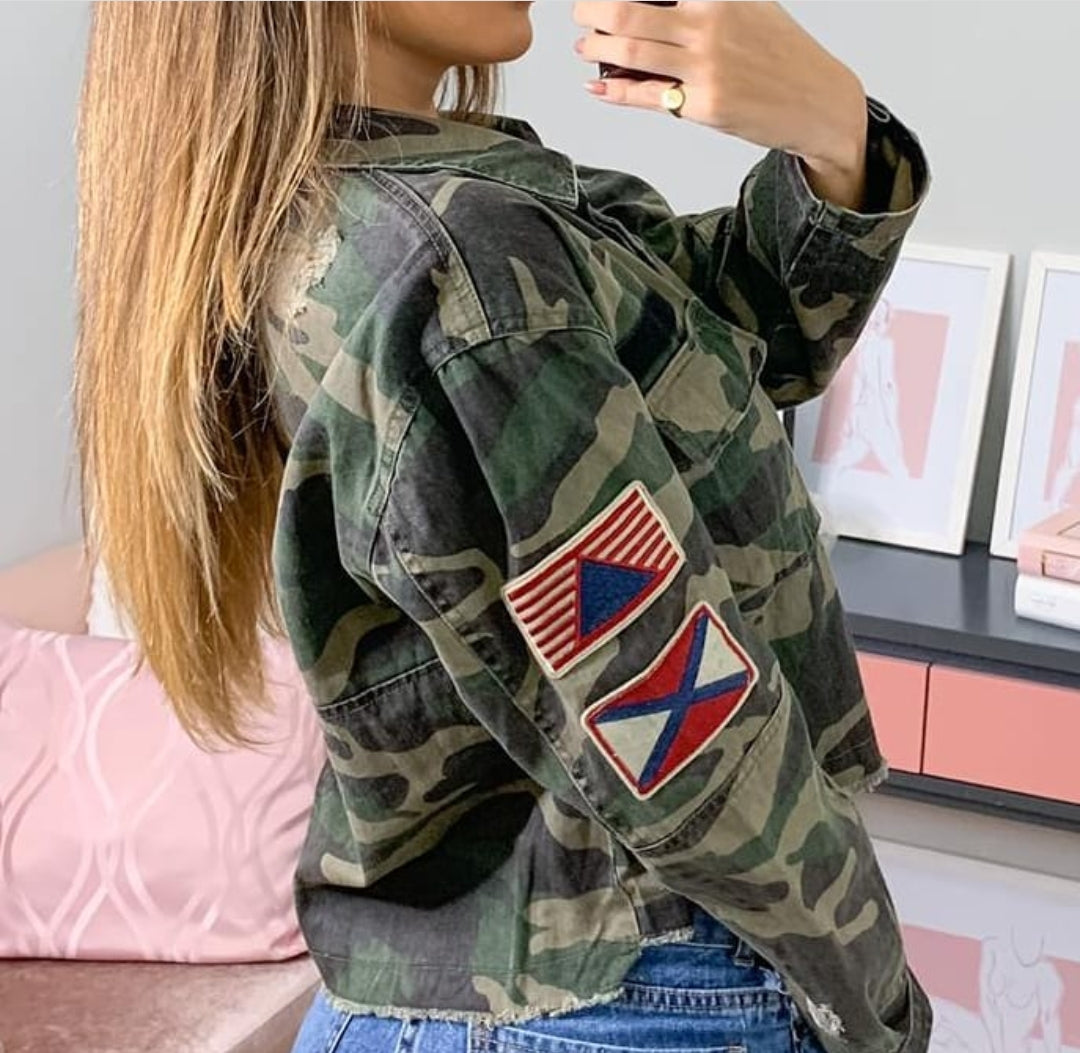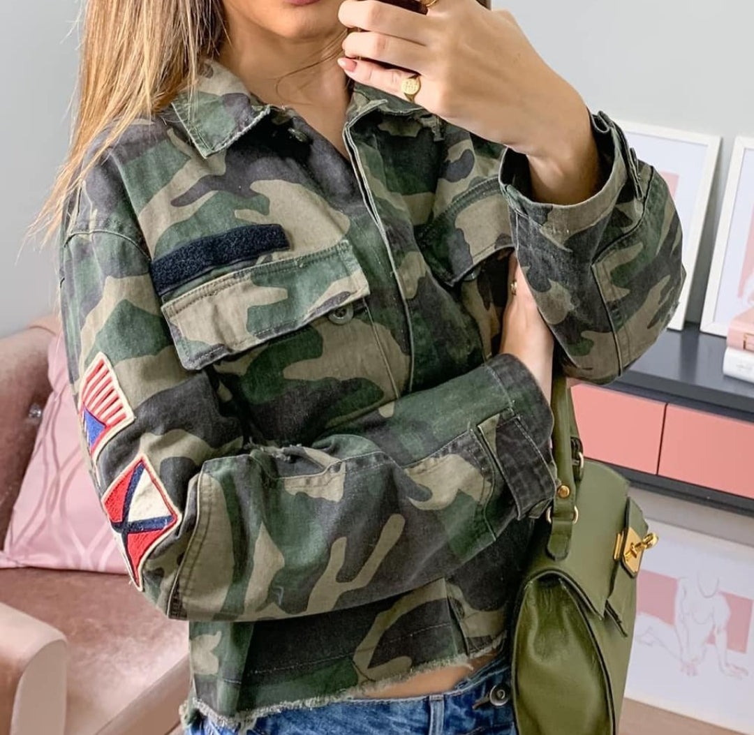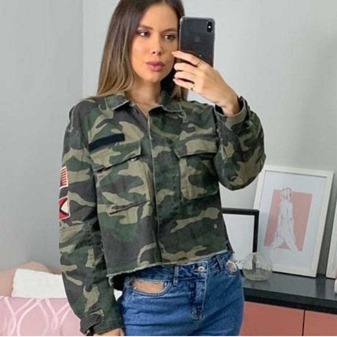Jaqueta em brim camuflada manga longa, com emblemas laterais e bolsos frontais.. bem descolada e moderna . Modelo mini. Disponível do p ao g.
